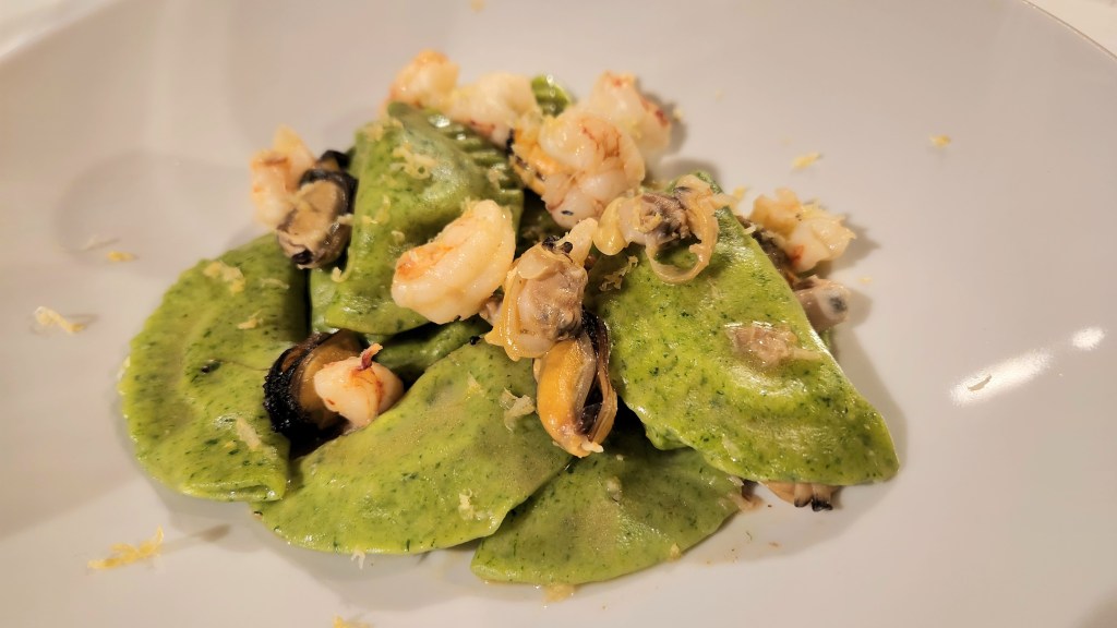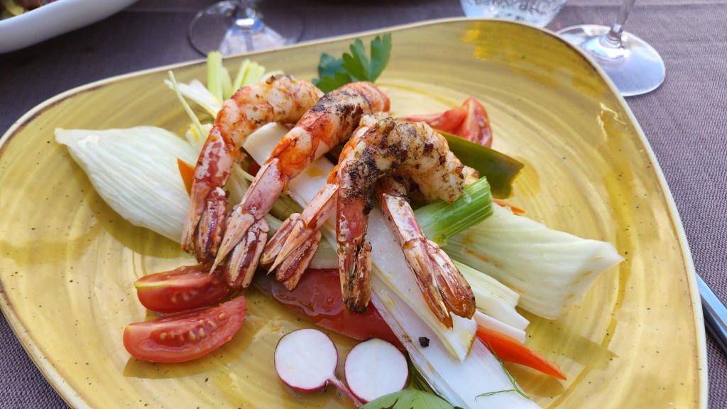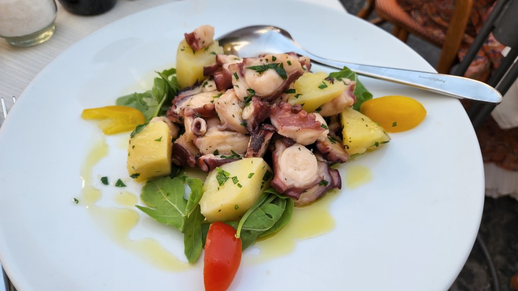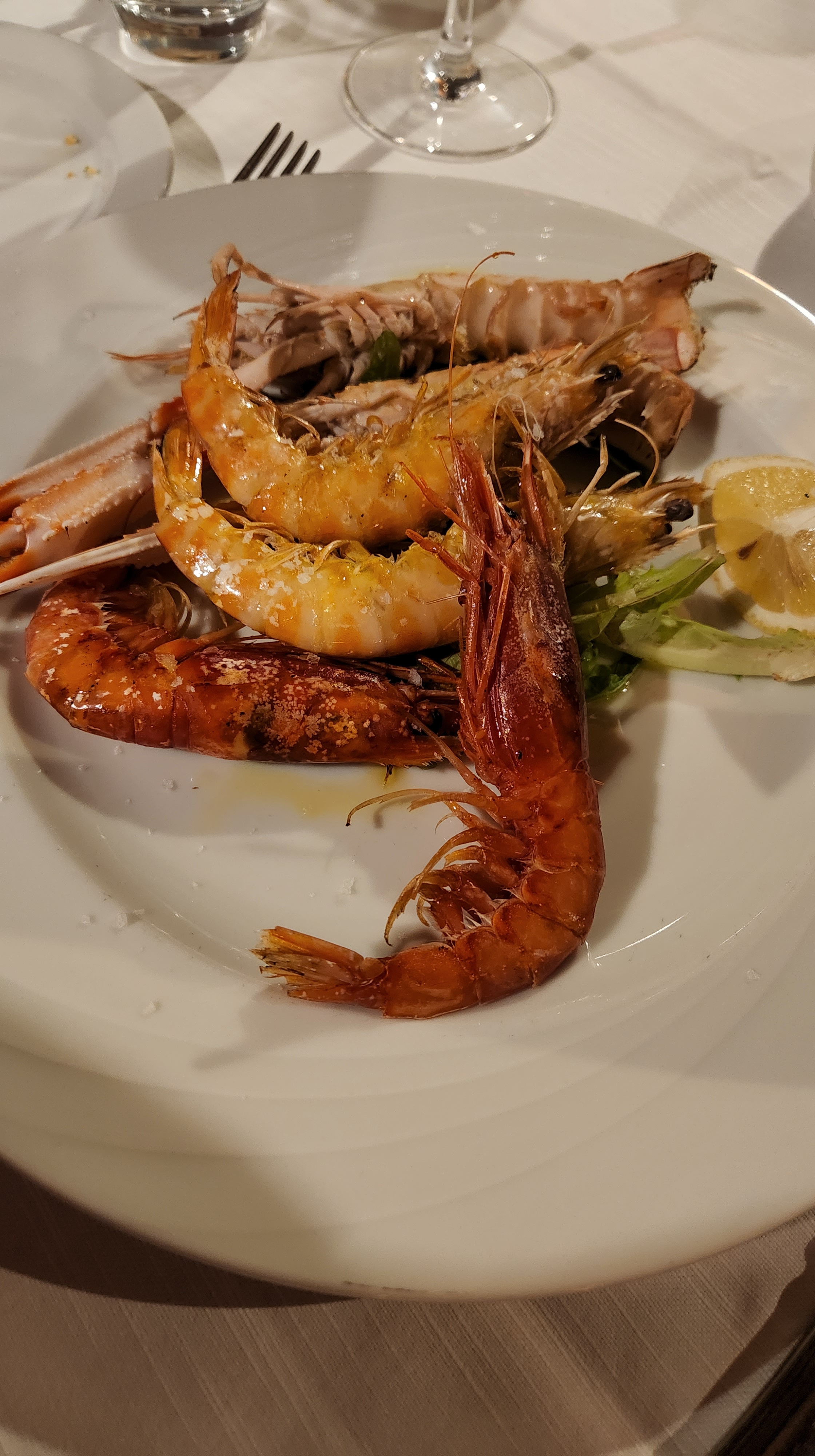 The seafood is amazing. Naturally, with Italy being a peninsula, you can get fresh seafood everywhere … fish, shellfish, squid … all grilled, fried, broiled. I’m a sucker for gamberoni alla griglia (grilled shrimp)! There is a seemingly endless variety of meats and preparation styles.