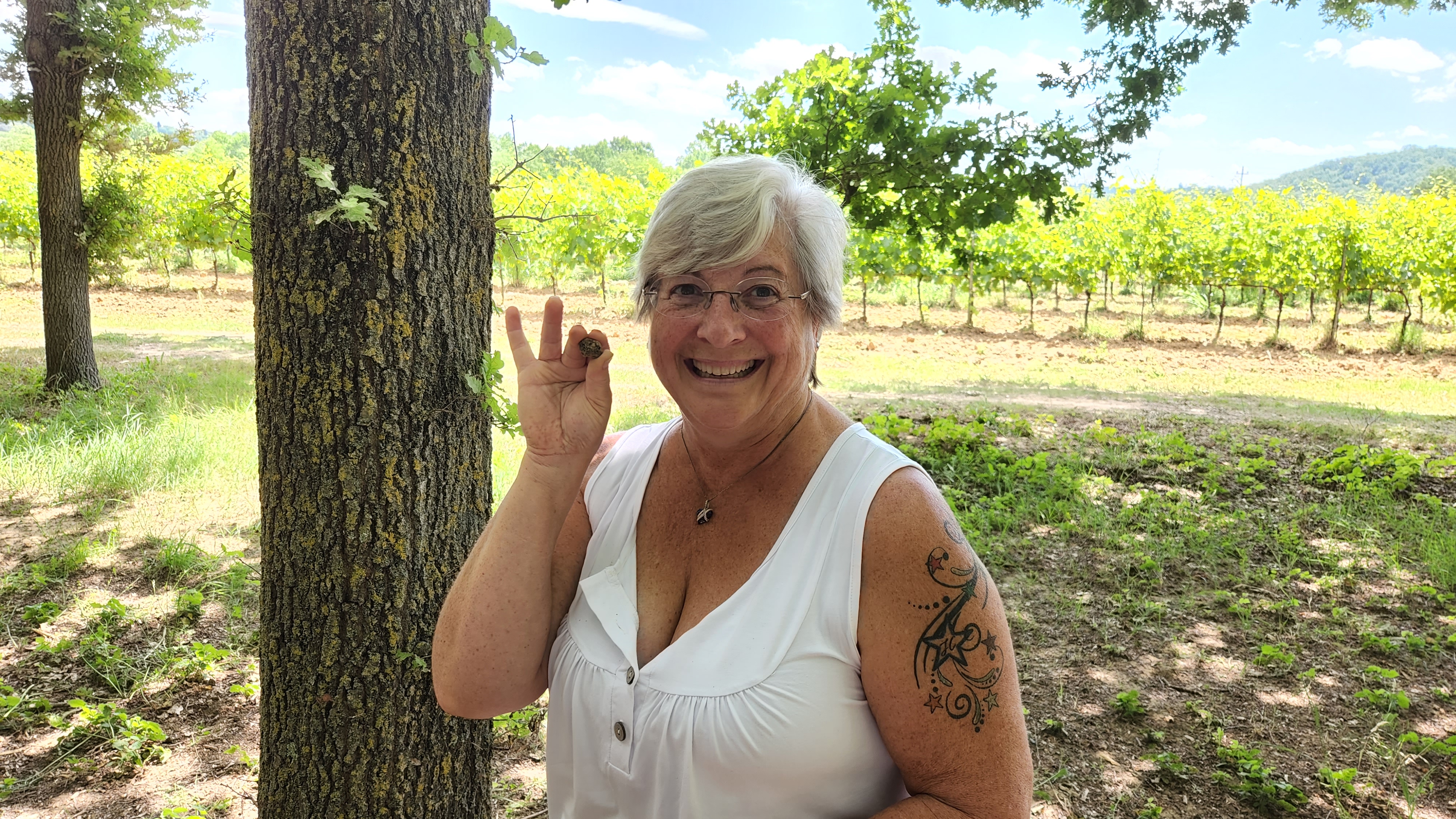 SUCCESS! We dug up the truffles the dogs had sniffed out. Each member of our group of six got a turn. When it was my turn, it looked like there was no truffle at the sniffed out spot. But … low and behold, a tiny truffle! Moreno laughed and described it as an acorn!