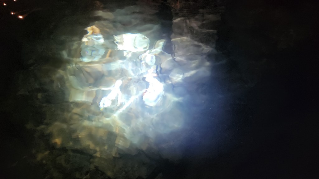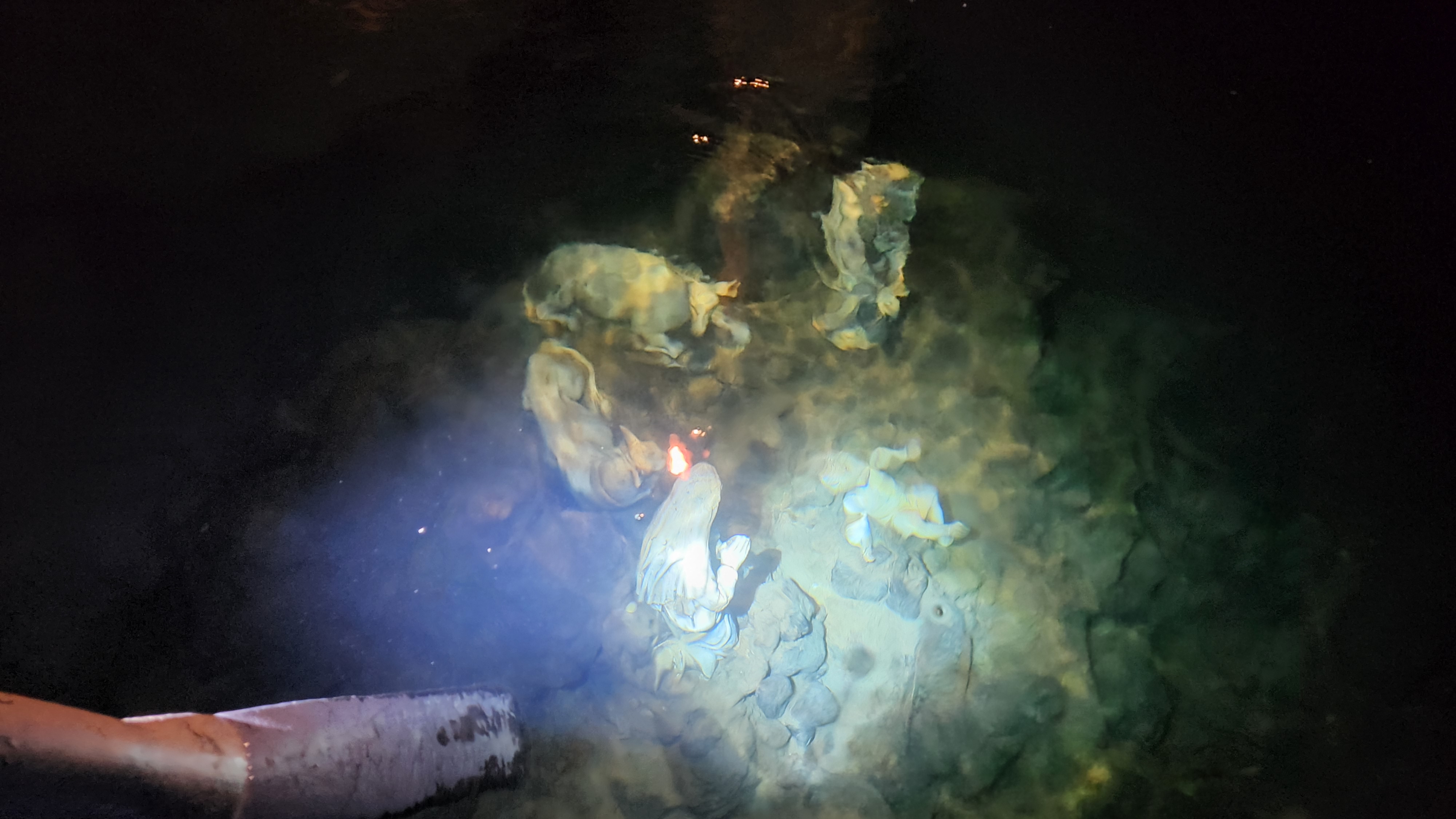 He headed over to a darkened corner of the cave, illuminated by a light shining into the murky depth. He told the story of some fishermen who found the cave and wanted to pay tribute to the Holy Family. Several swimmers carried sculptures of Mary, Joseph, the Baby Jesus and some other figures from the Christmas Nativity through the tunnel and set them up in the corner of the cave.