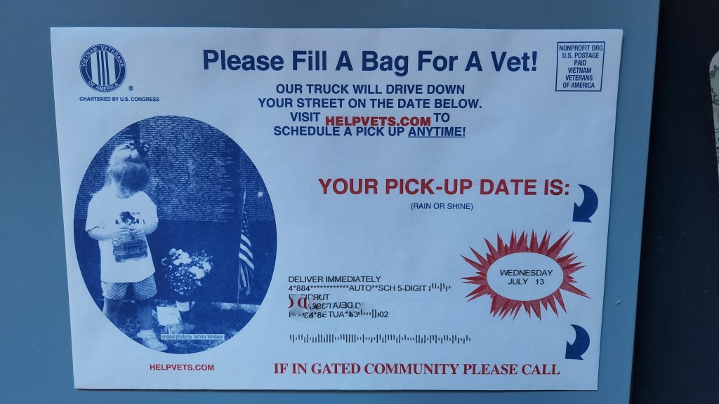 I sit here looking at an envelope on my desk that came in the mail last week. The front asks “Please fill a bag for a Vet.” When it arrived, we laughed about the perfect timing. I’d just cleaned out my side of our closet and we were getting ready to go through Greg’s clothes. A week later, we’ve accumulated five bags for the Wednesday pick-up.