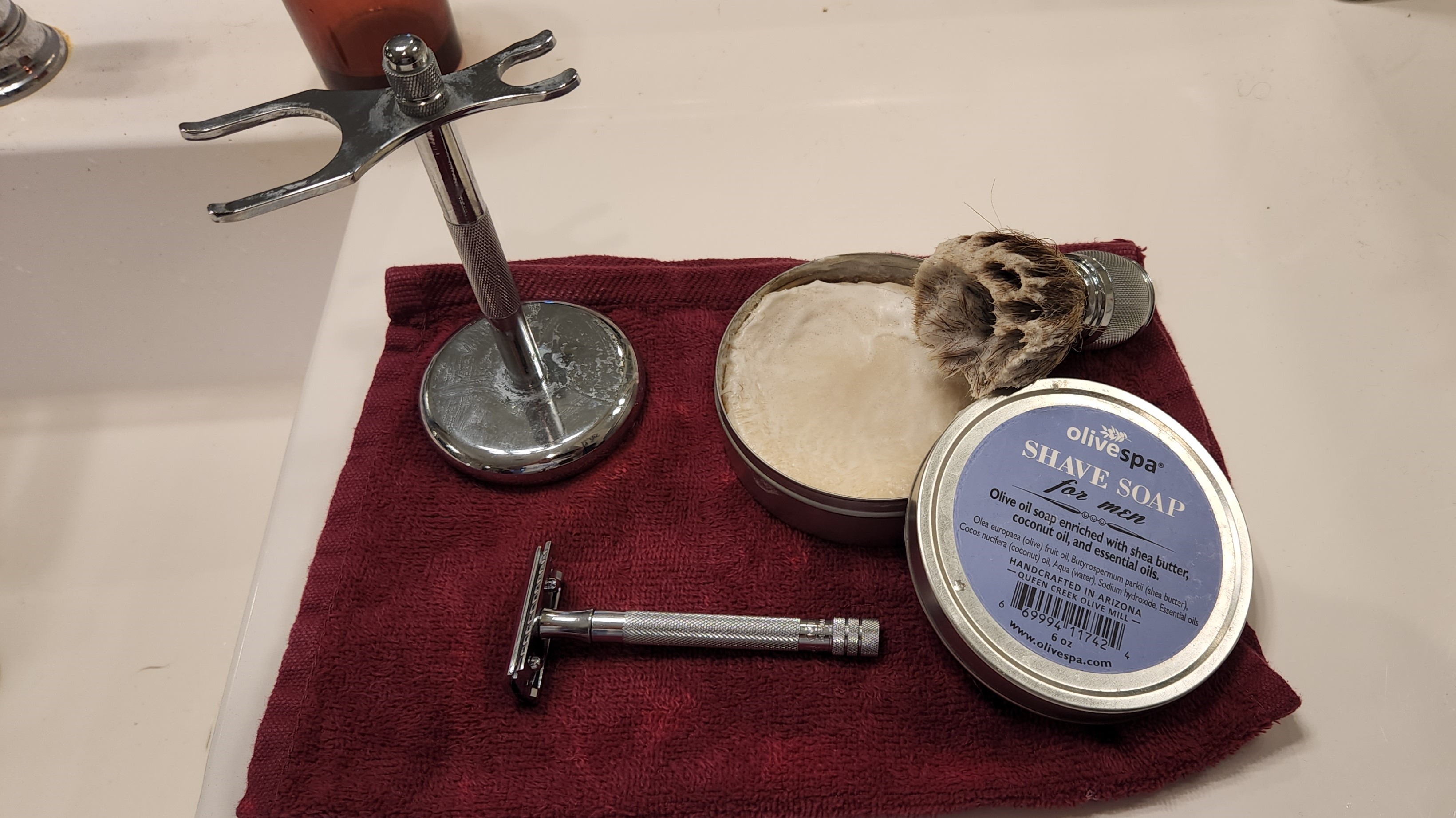 Plagued by ingrown hairs, I finally went back this week to shaving with an old-fashioned safety razor. Brushing olive oil and shea butter shave soap on my face with the badger-hair brush simply feels luxurious. The weight of the German-made Merkur razor feels good in my hand as I carefully scrape away my morning beard. It takes twice as much time as with the five-bladed expensive razors I used before, but it’s totally worth it.