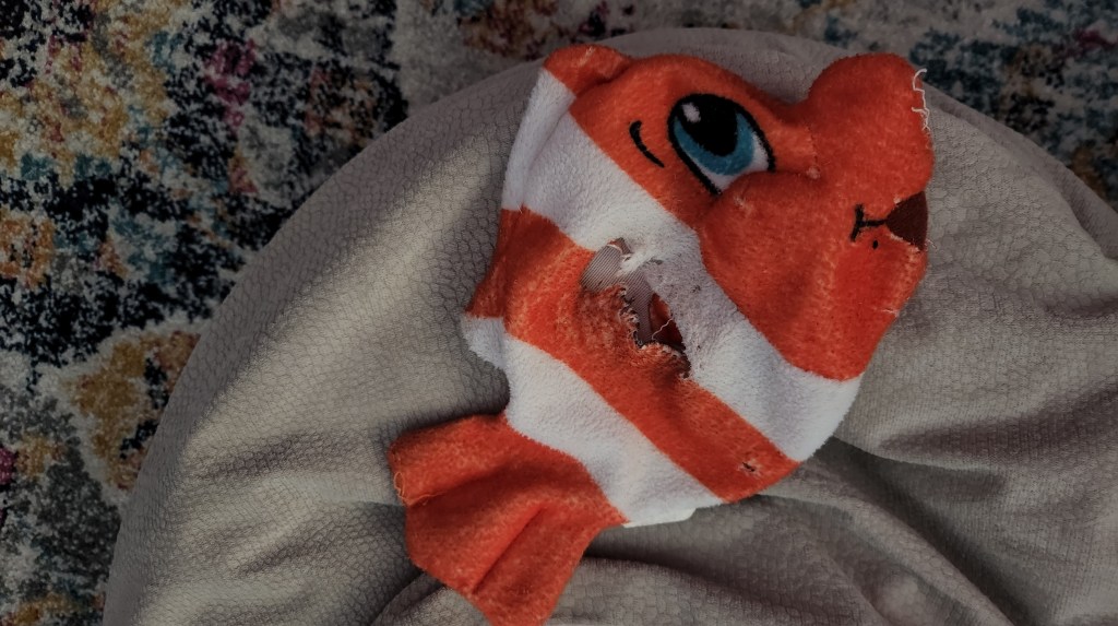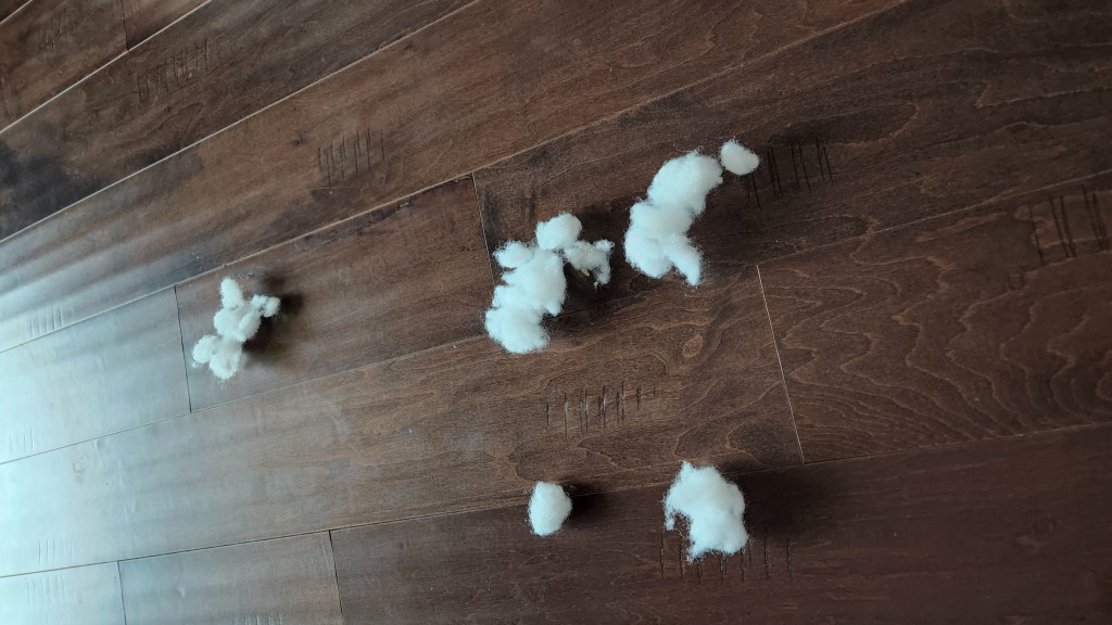 He uses those holes to stick his nose in and pull out the stuffing. There’s stuffing everywhere.