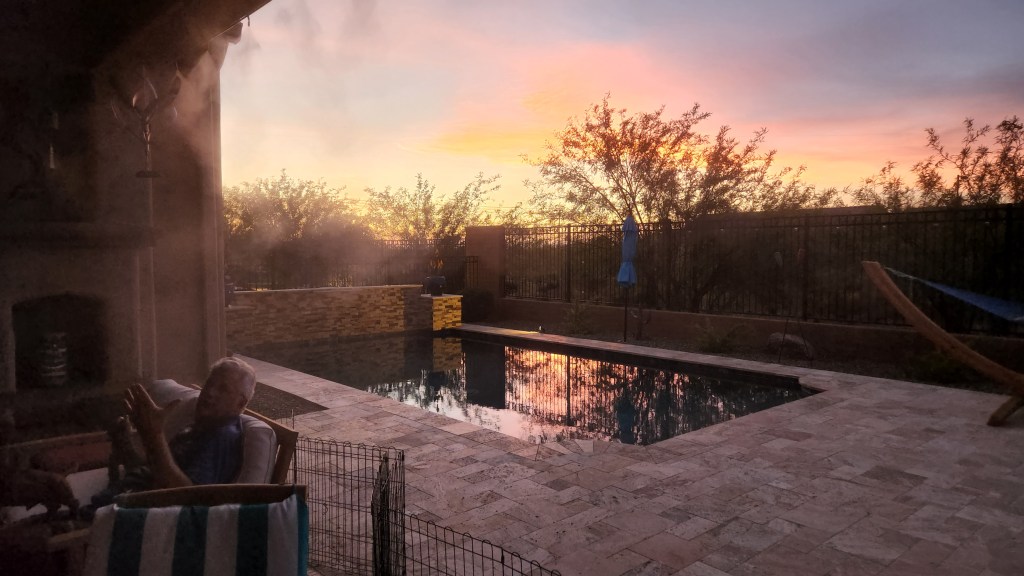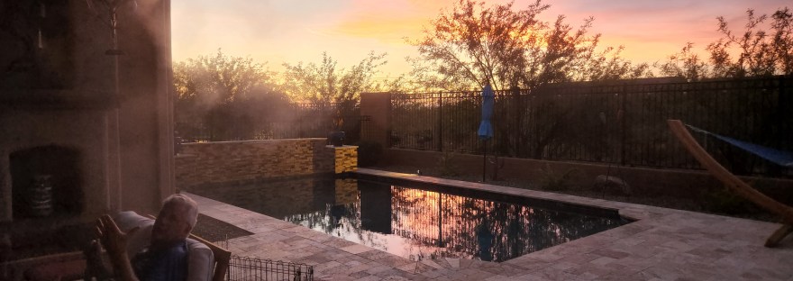 Like the meme’s author, I’m not ready for fall yet, either. I’m enjoying popsicles, pool time and piña coladas (not really, but I wanted another summer “p” word). Greg and I are loving our new misters and enjoying sitting outside in the evenings watching the spectacular sunsets.