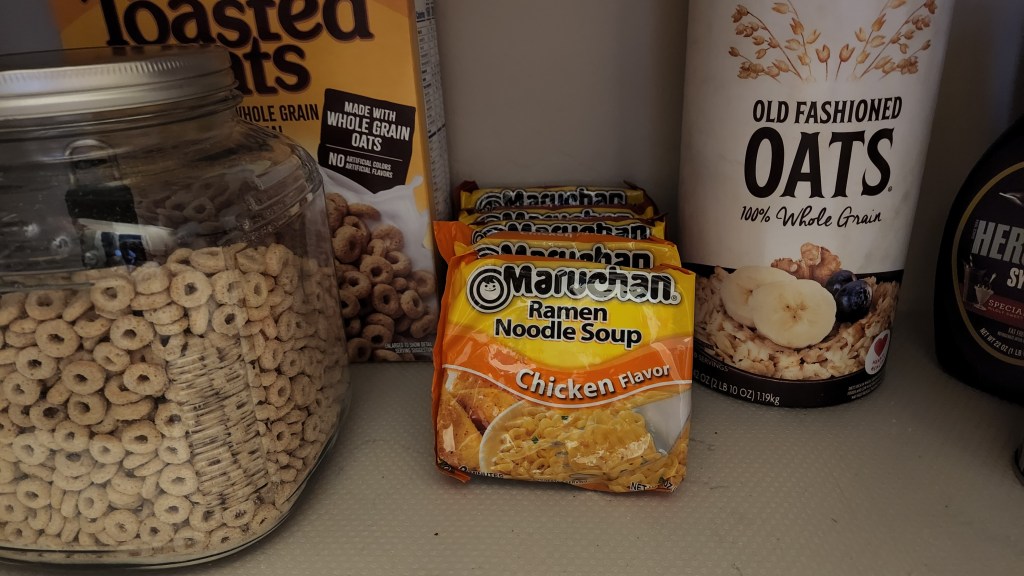 I considered a box of macaroni and cheese. That blue box is a favorite of mine and a go-to to satisfy my craving for something bad. On this particular evening, I wasn’t feeling the love. I kept looking while I munched on two Oreo cookies. Then I spotted the packages of ramen. Perfect! It’s quick, easy and just filling enough.