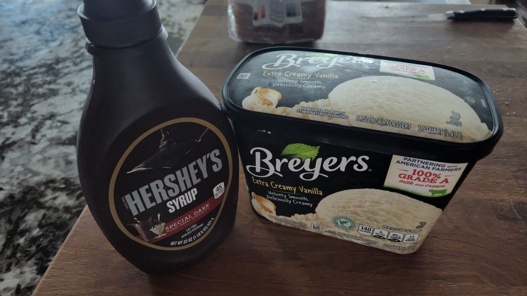 Instead, I did what any self-respecting single-parent-of-a-puppy-for-a-few-days person would do. I grabbed the ice cream and the chocolate sauce!