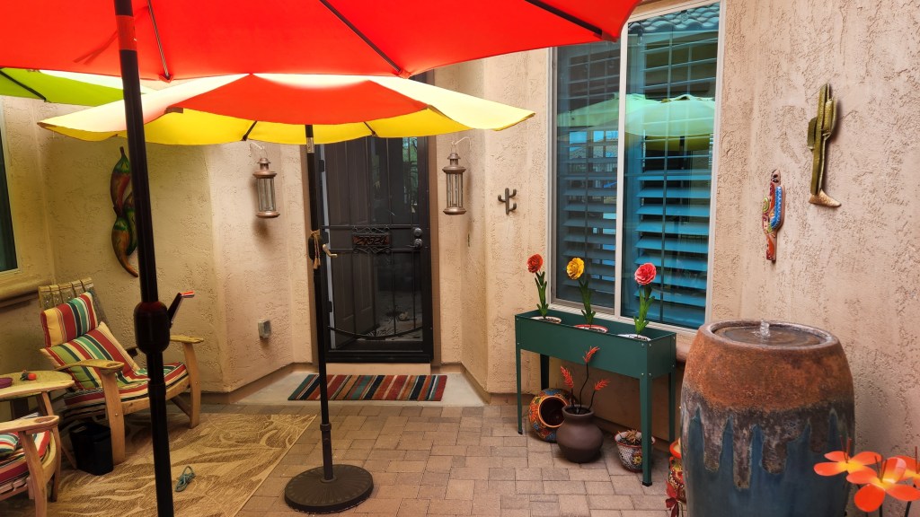 I love the colors and the concept of “fiesta.” We’ve captured those bright colors in our courtyard with lots of “made in Mexico” pottery and a couple of chairs crafted by an artist in Glendale. Visitors are welcomed with a bright, cheery scene as they come through the gate.