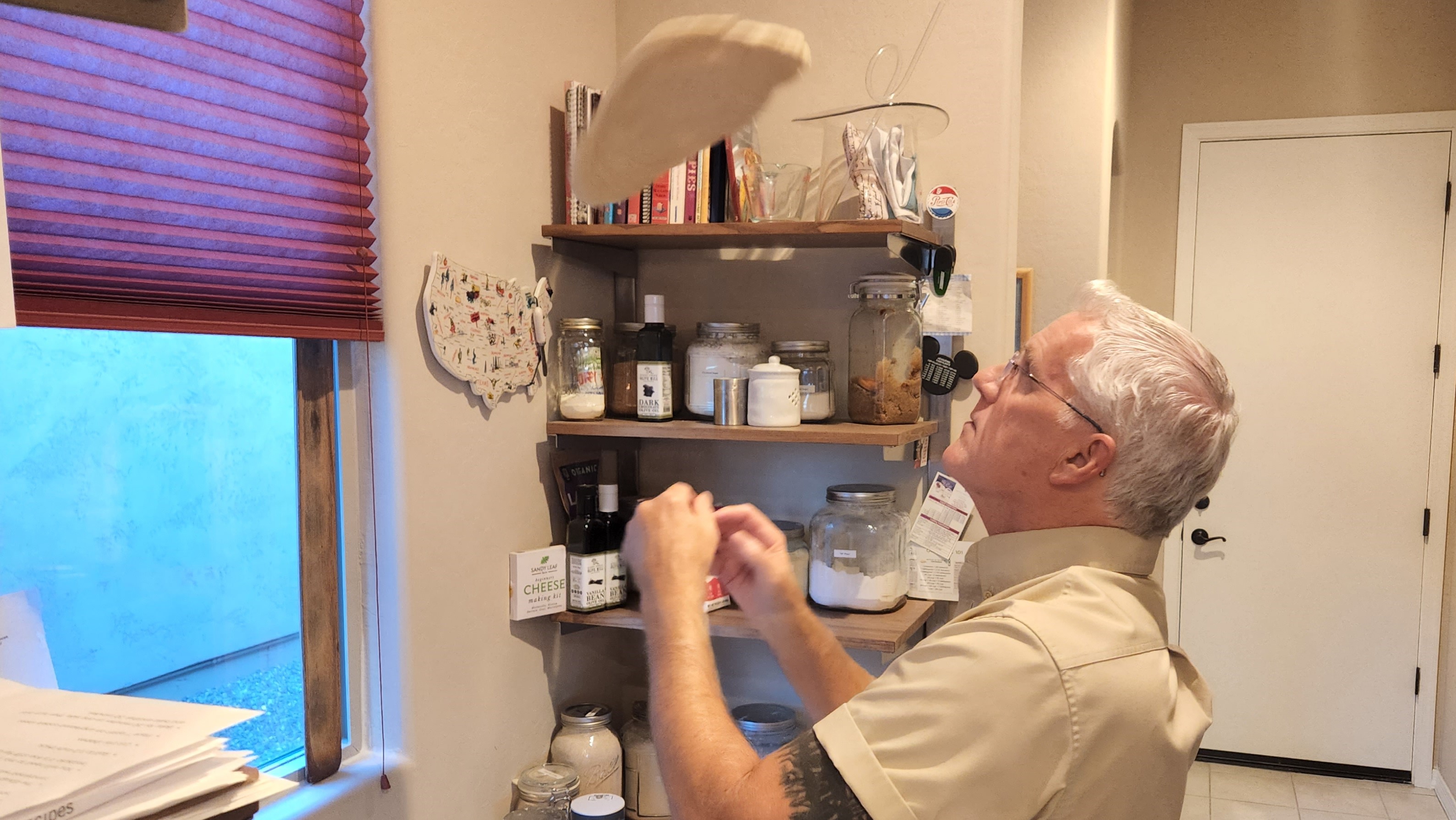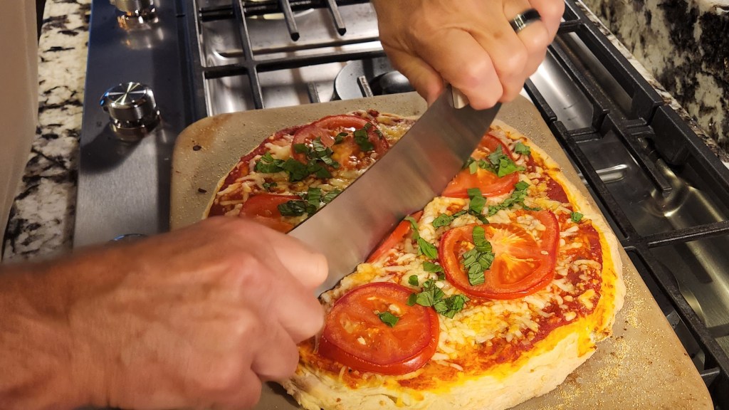 Knead, let the dough rise and it’s time to get creative. That is when I learned something new about my husband. Greg knows how to stretch pizza dough! He was manipulating it and tossing it into the air while I stared in shock. He was recalling long-unused skills learned from high school summer jobs.