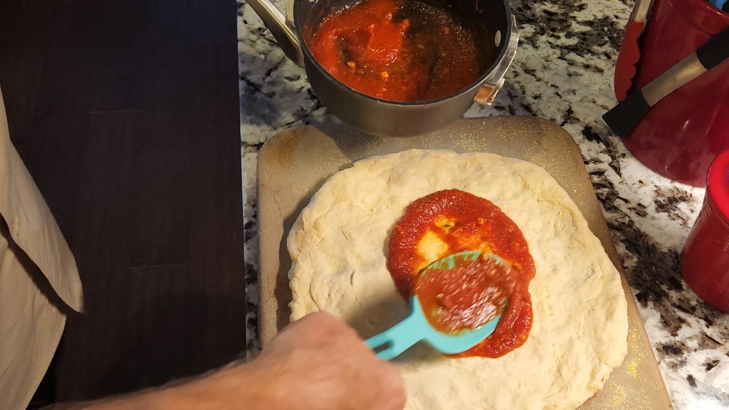 I was thrilled and amazed. Then I remembered we’d gone a couple of years without pizza at home! I laughingly teased him about making me go without pizza for so long! He responded by expertly ladling on the sauce and spreading on the toppings.