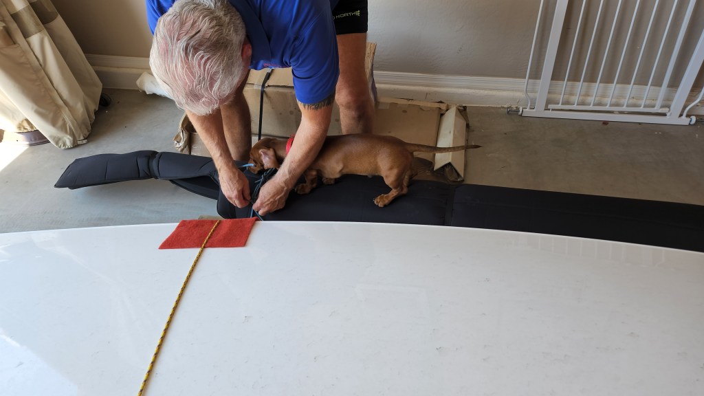 The roof rack (yeah, this is light enough to pop onto the top of the SUV) arrives today along with a system to lift it up to the ceiling of our garage when it’s not on the water.