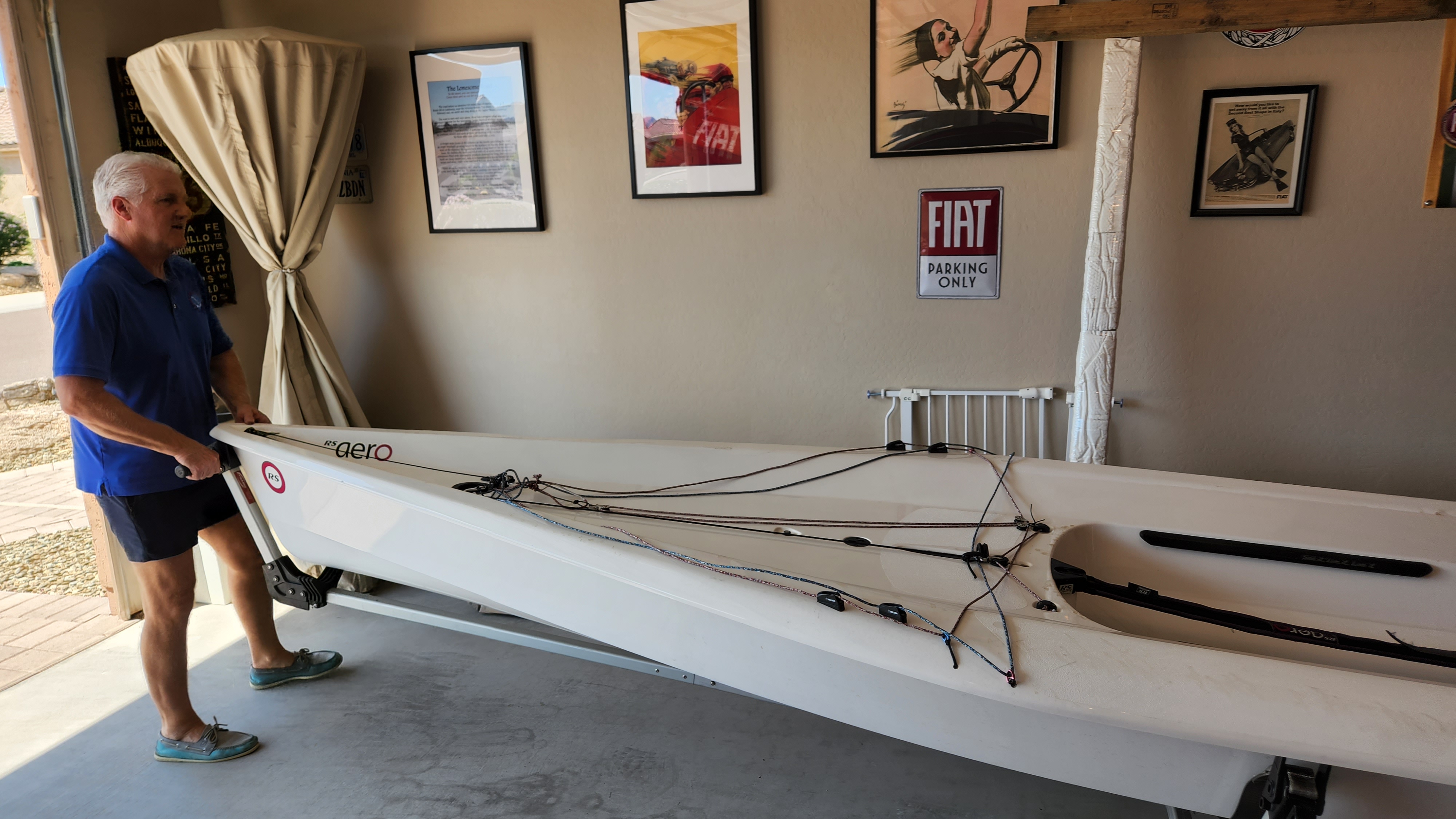 The Aero is also a single-handed dinghy, but unlike the more well-known Laser Greg had been sailing, this craft is a mere 68 pounds. In fact, the packing material on the truck probably weighed more than the boat. It’s also a much more modern design with state-of-the art materials unavailable when the Laser was designed five decades ago!