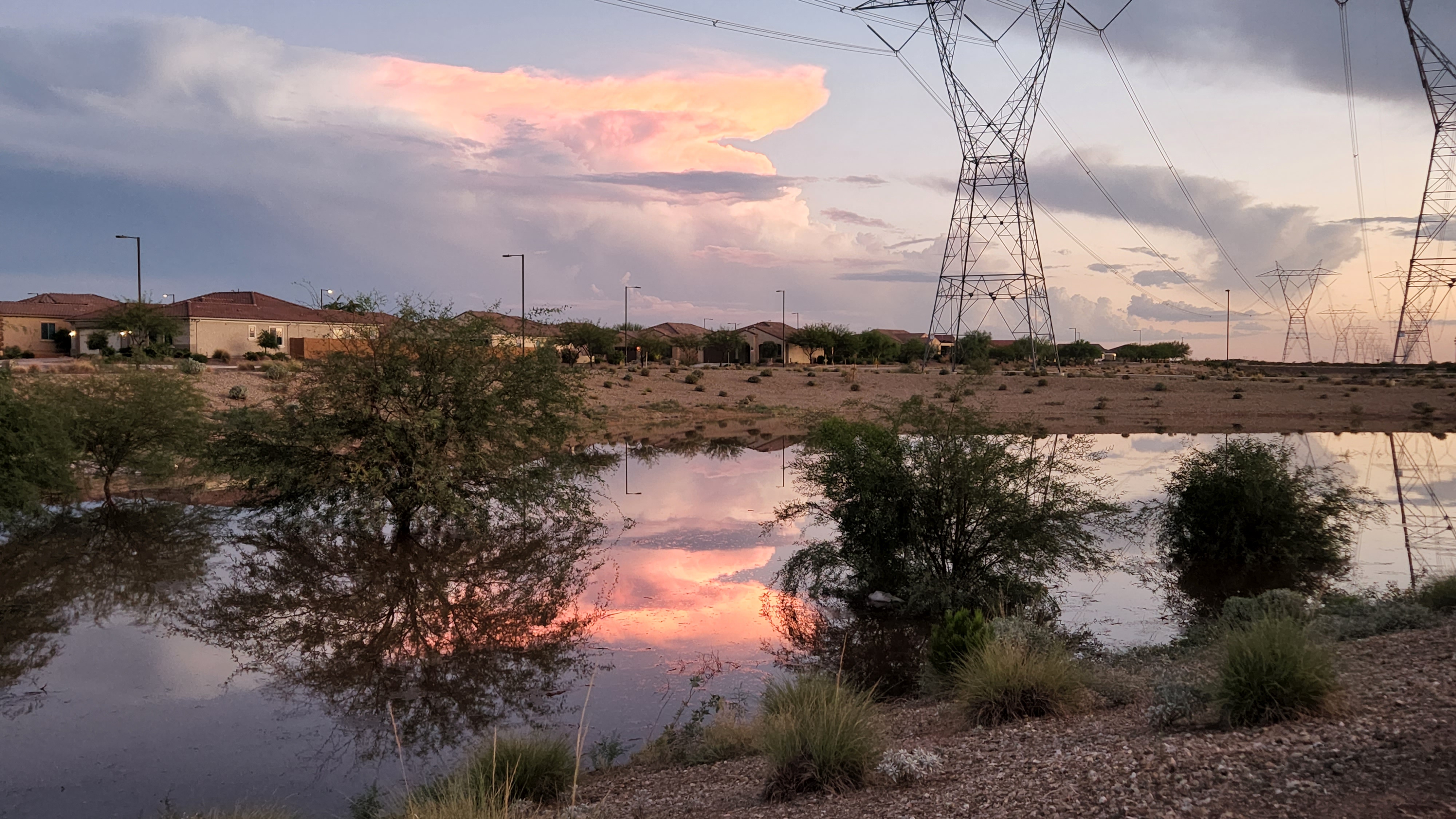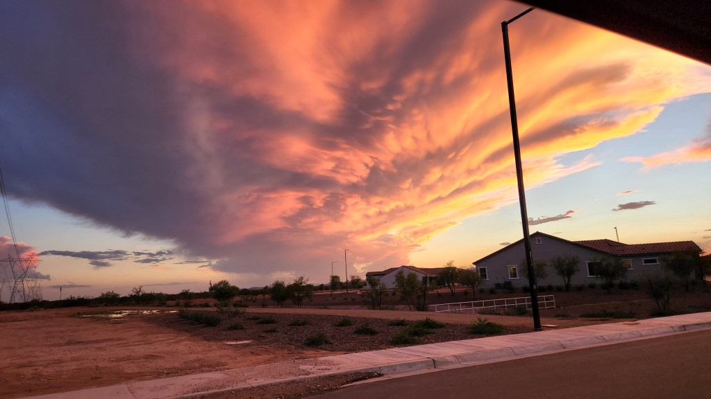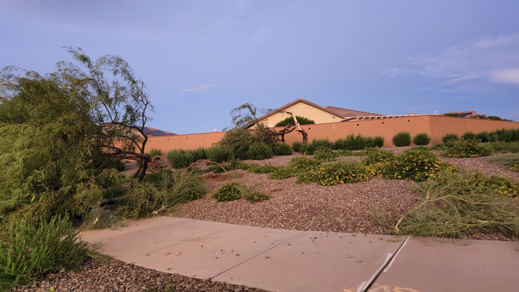 The temperatures drop to gorgeous levels and the humidity, a rarity in the desert, returns to its less-muggy state. We hopped into the golf cart to cruise the nearby streets and survey the damage as the daylight faded away.