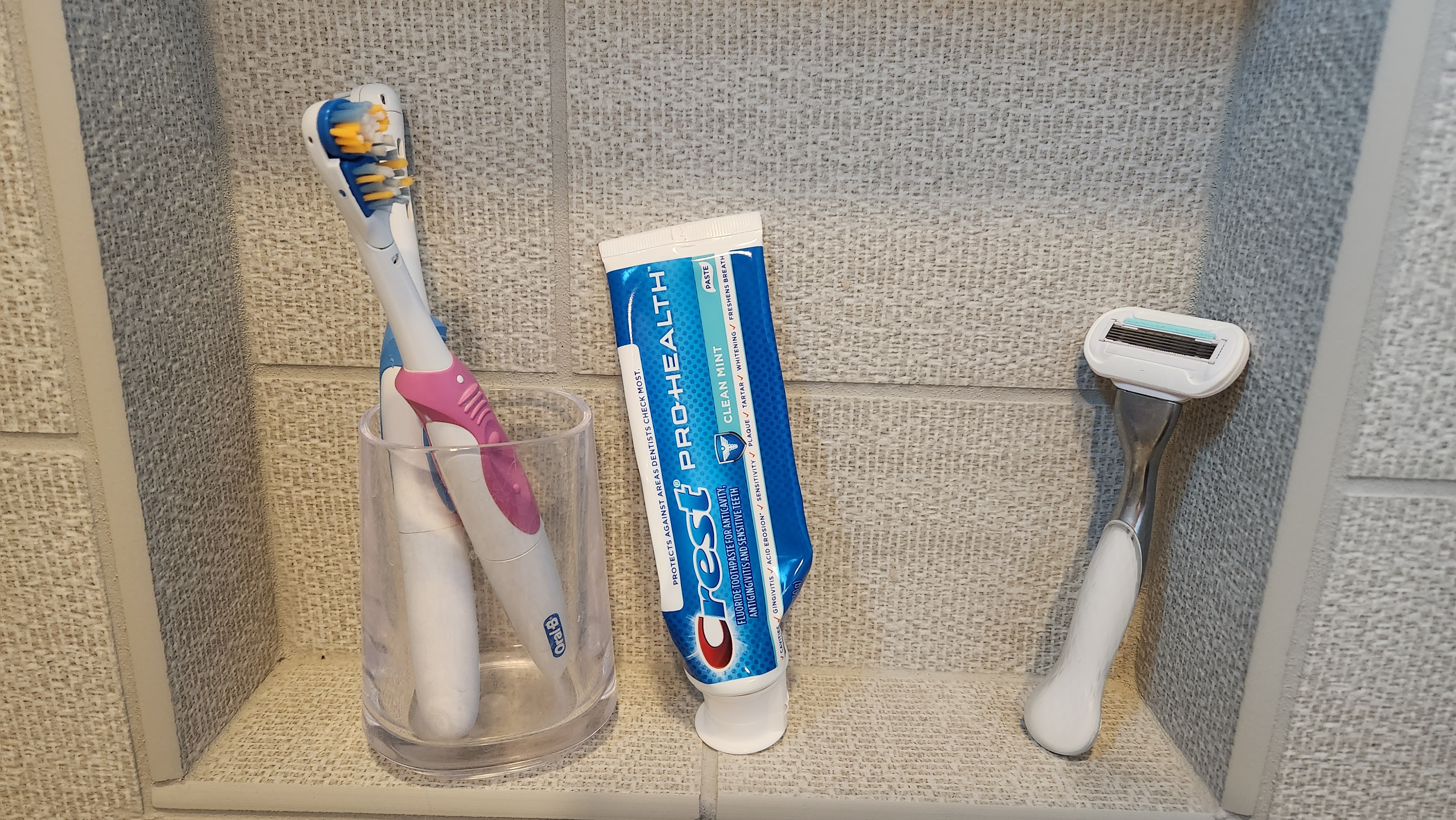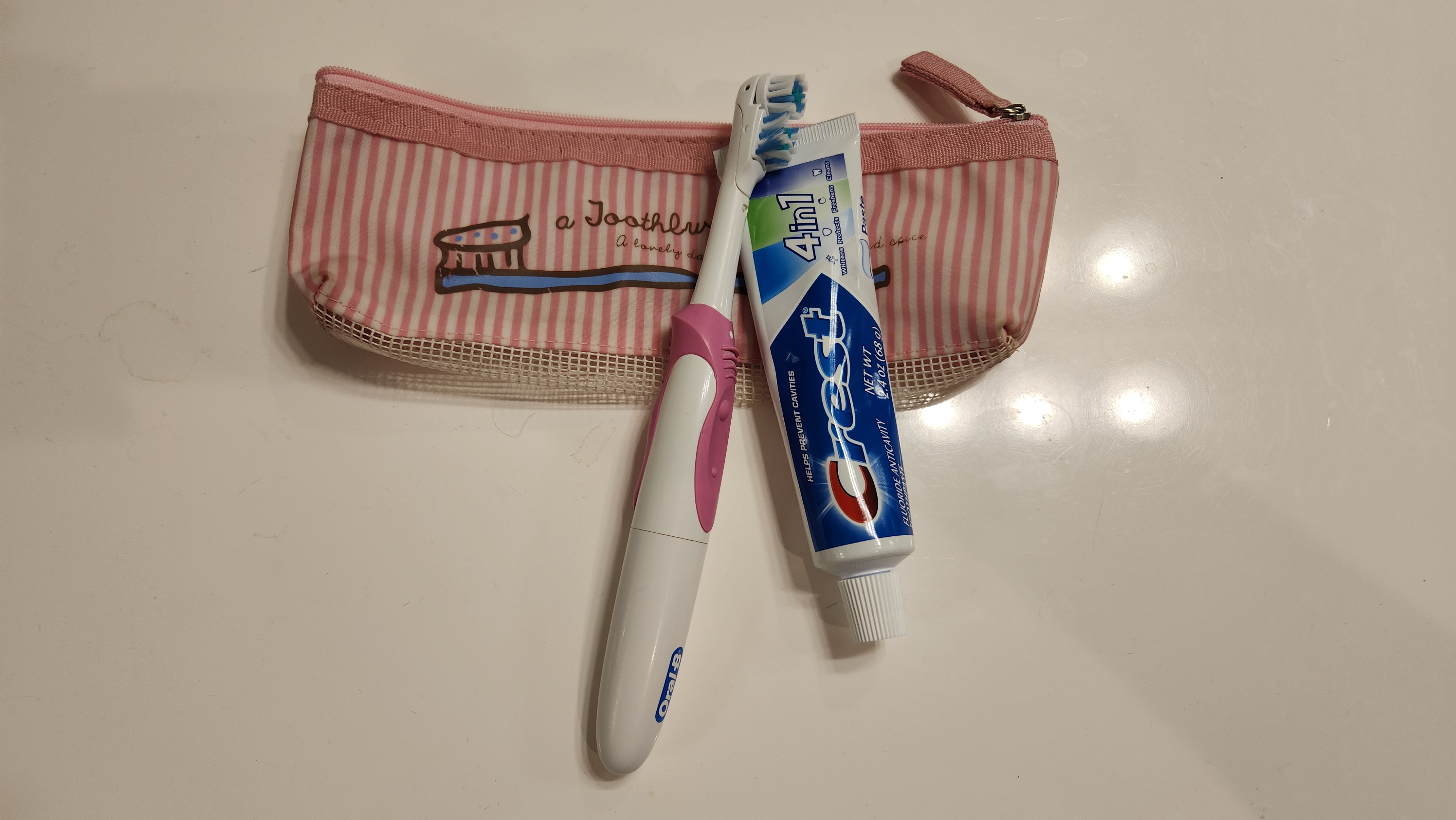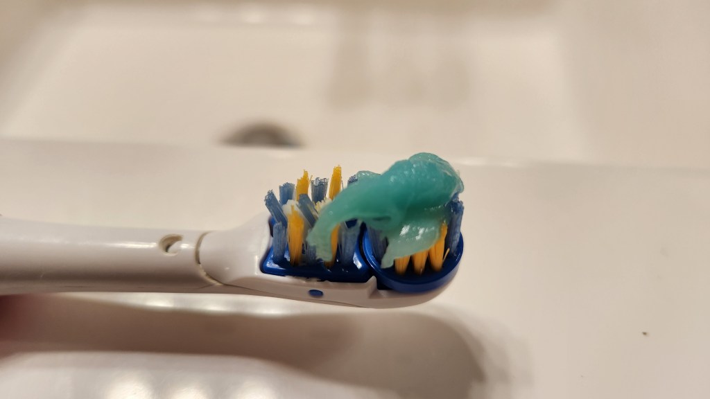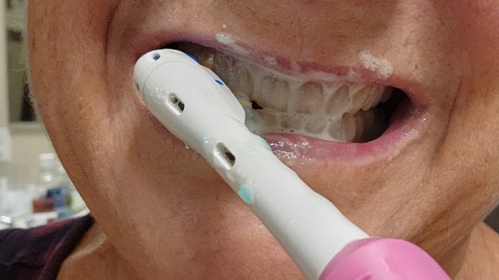 All three of my toothbrushes are the same battery-powered models. I squeeze out a healthy dollop of toothpaste and hit that start button, letting the head spin onto my pearly whites to erase the gack and gunk that grow there naturally. A rinse or two later I grab a floss pic and scrub out the bits between my teeth before checking my smile in the mirror.
