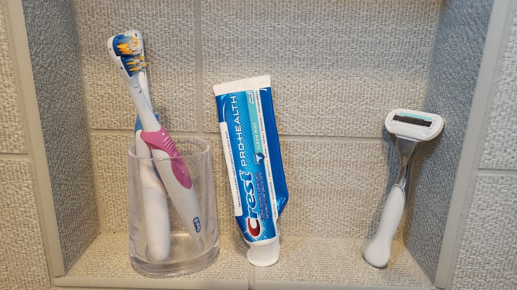 All of this is possible because of my trusty toothbrush – or should I say toothbrushES? I have three! I keep one packed for trips. I keep one by the bathroom sink. I keep one in the shower. I know it may seem odd, but I brush my teeth in the shower.