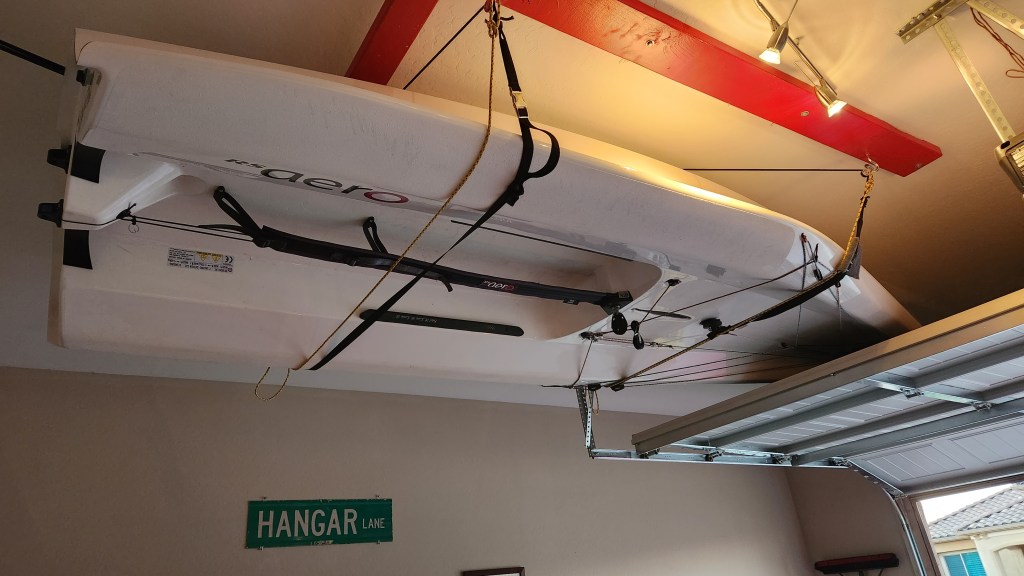 This first sail was short, as I had already spent the morning on the lake completing the last portion of a powerboat certification course for the Arizona Yacht Club, so I headed back in. De-rigging and getting the boat back on the car took about 45 minutes (thanks again to another stranger who helped me get the boat on the car … sailors and boaters are truly a fraternity!). Judy and I met at Dillon’s Bayou, an on-the-water restaurant and bar at Pleasant Harbor Marina where we had a celebratory drink and nosh. We headed home and nestled Andiamo in her perch in the garage. I couldn’t stop beaming.