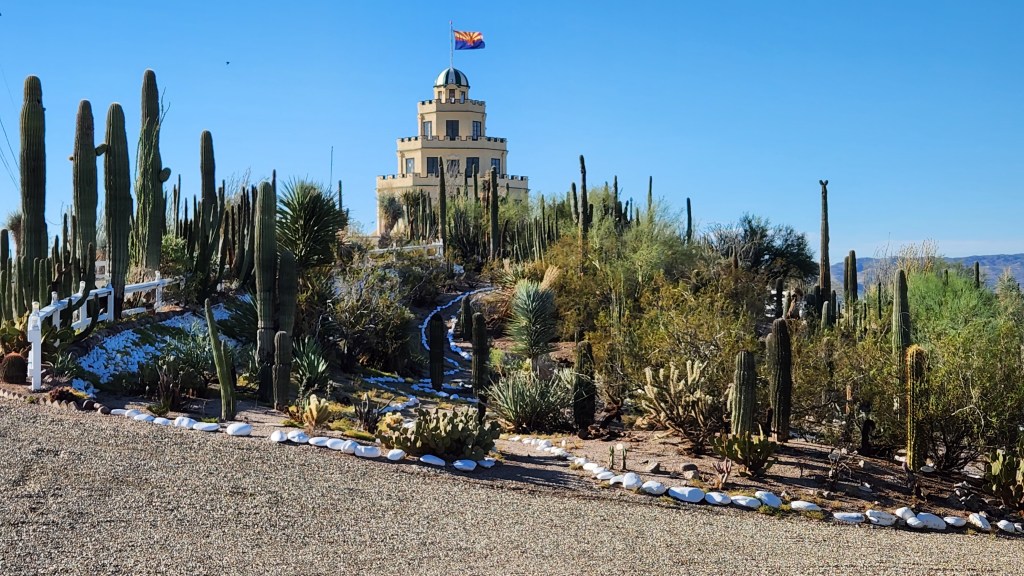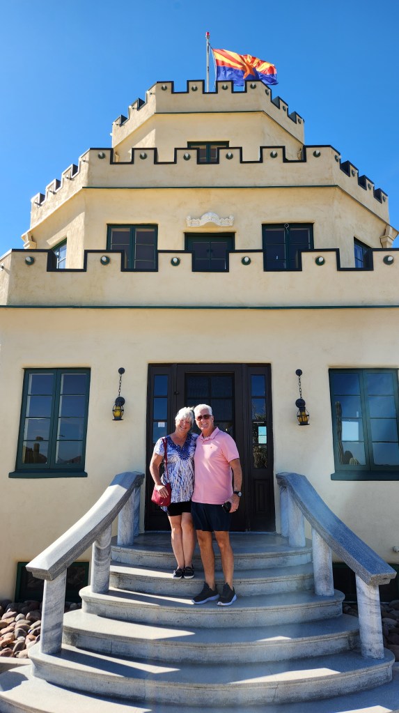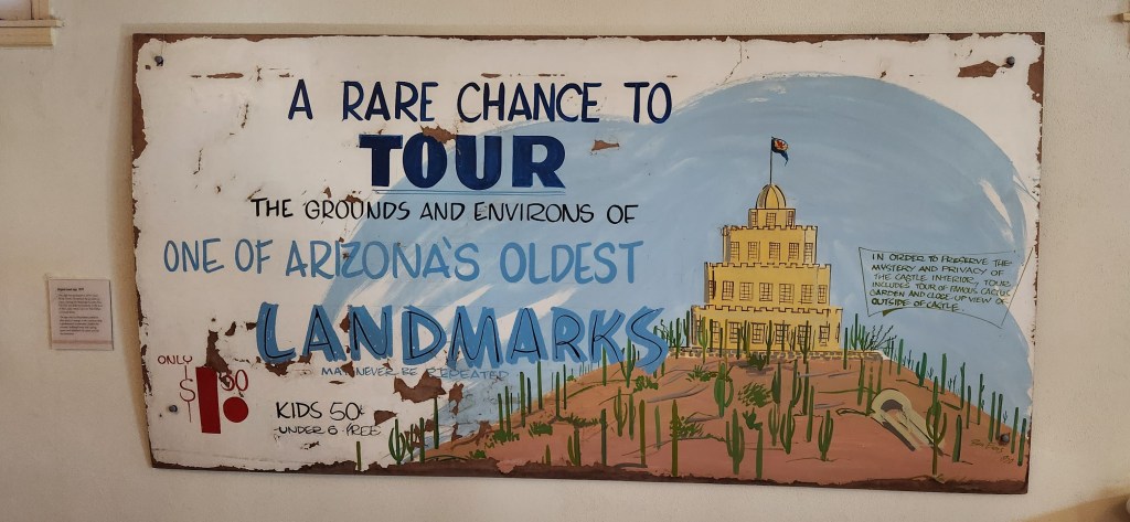 Such was the case when the date finally arrived for our visit to Tovrea Castle. It is notoriously difficult to get tickets to the Phoenix landmark. You have to enter a lottery for a Friday, Saturday or Sunday tour during the fairly limited tour season. When you enter, you choose date options and ask for a specific number of tickets. If you win, you pay in advance. You can cancel your purchase, but it’s an all-or-nothing deal. The lottery is only open twice a year for a couple of weeks. IT IS OPEN NOW THROUGH OCTOBER 15. So, the restrictions can be seen as a bit daunting.
