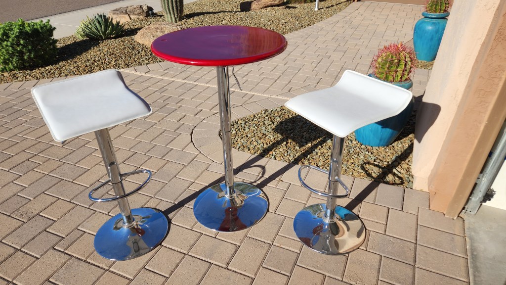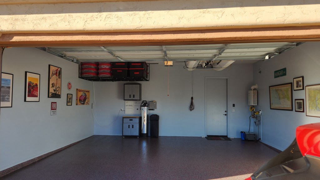 Ever since Judy and I moved into our new Arizona home, we wanted to customize the garage a bit. Growing up, garages tended to be dingy dumping grounds for all the detritus one collects during a life. Being “car people,” we wanted our garage to be a bit more of a showcase for our little Fiat sports car, so we bought some prints and posters, made sure our storage solutions were neat and organized, and even bought a snazzy red cafe set and cappuccino maker to help set the scene.