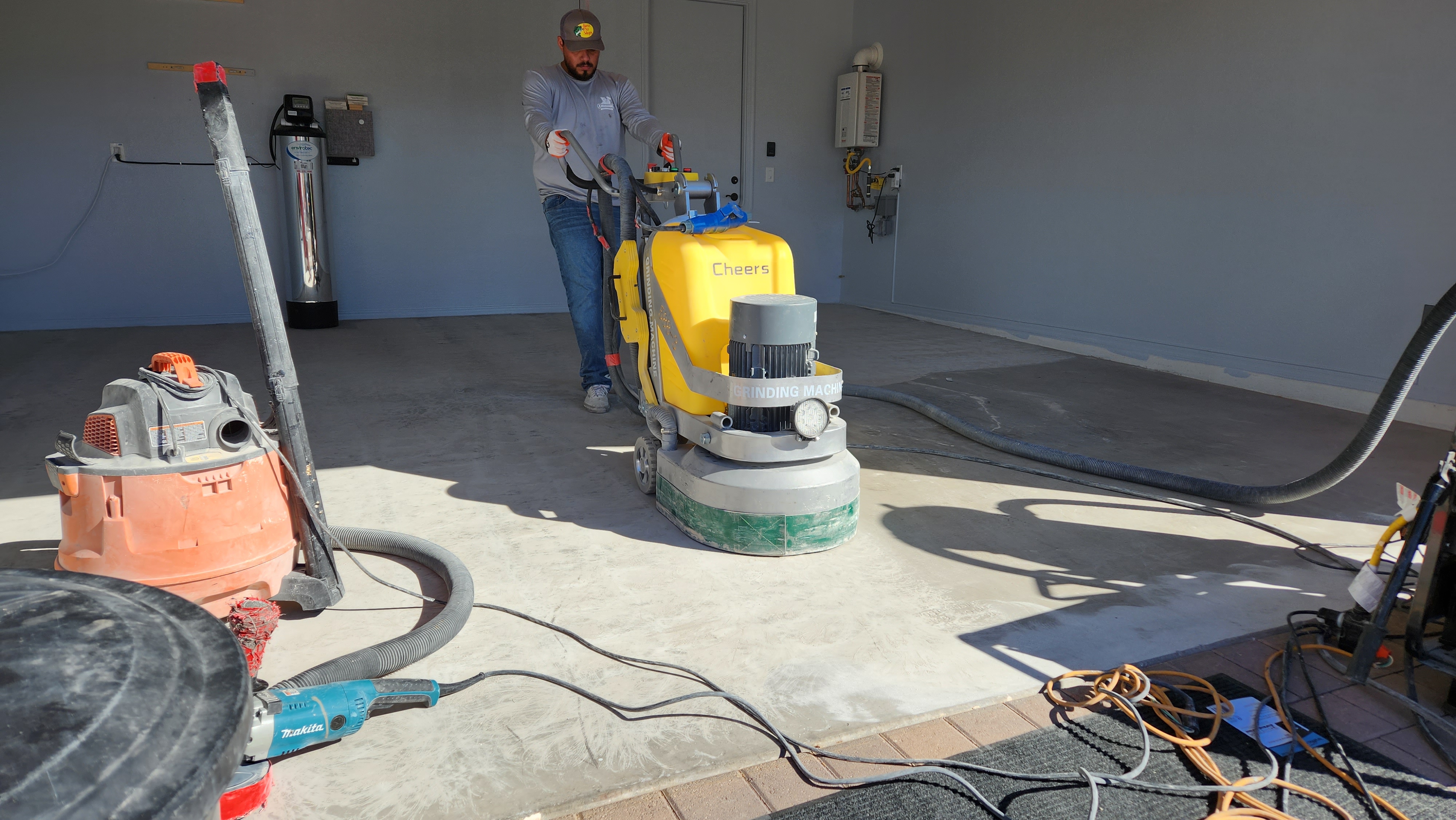The professionals came out to fix-up the floor, cleaning, scouring and prepping the concrete surface for the new finish.