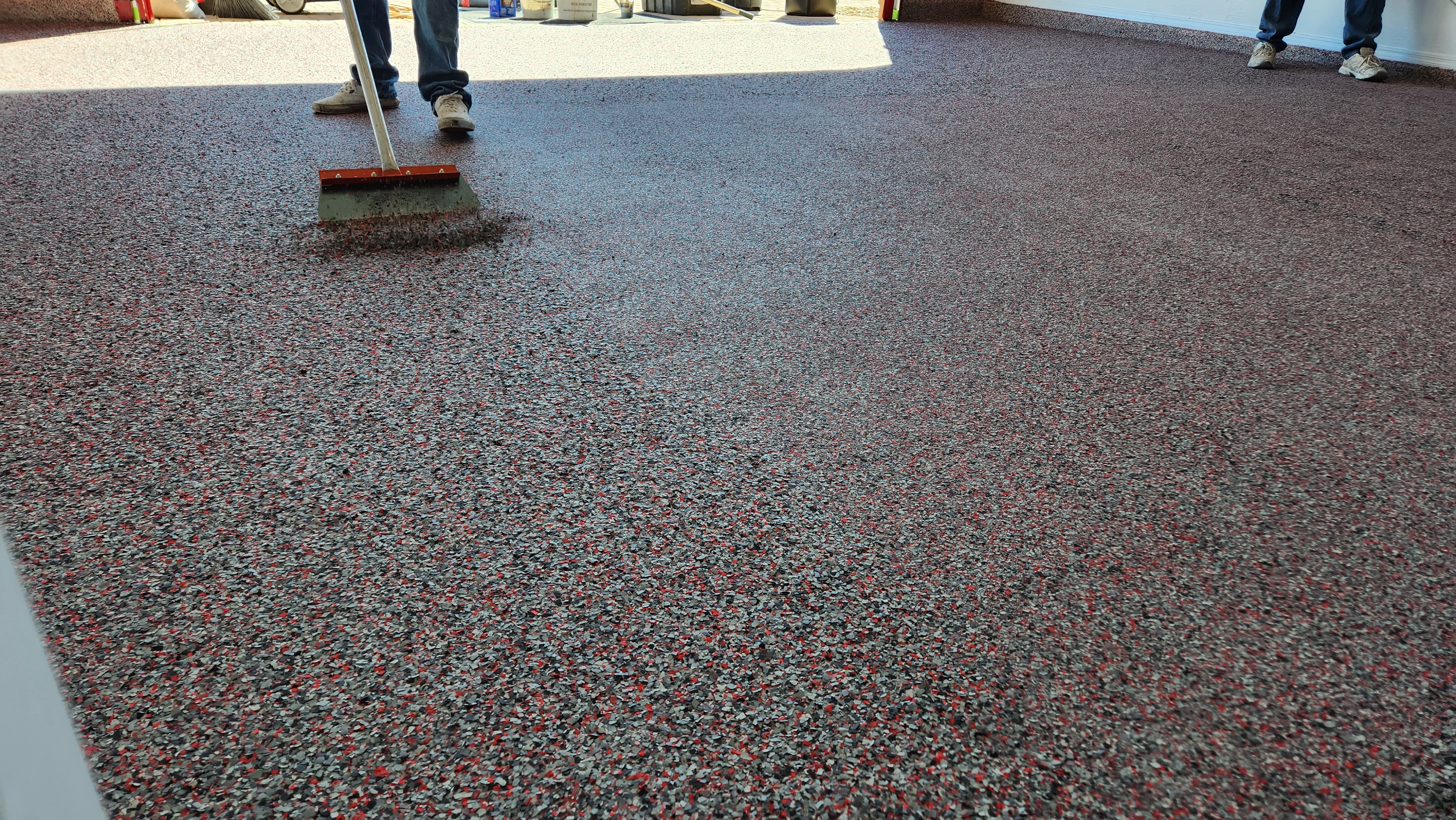 The flakes are cast in a random pattern, which gives the floor a look of depth … and fun! It’s scraped and smoothed and allowed to set up.