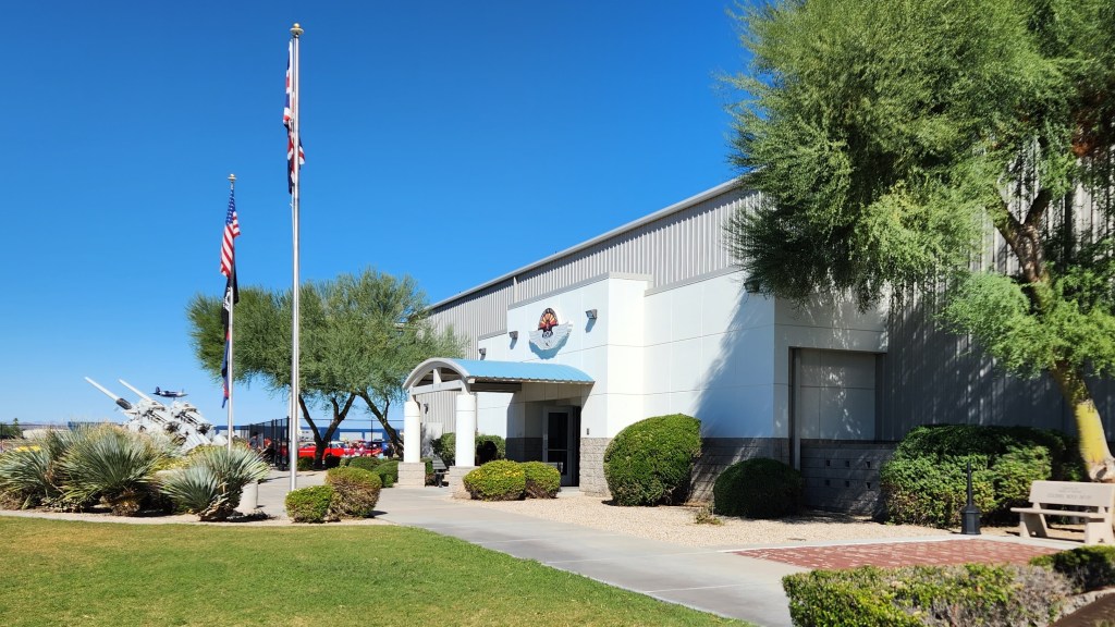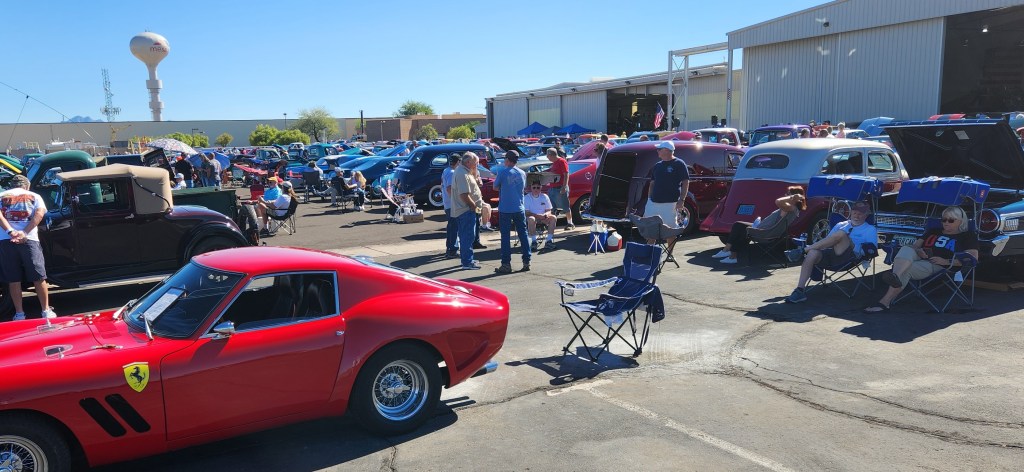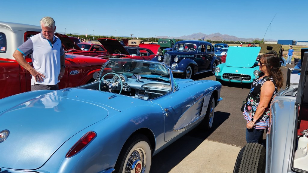 A few weeks ago, an event suggestion popped up on Facebook that sounded like a great Fall outing for us — a Vintage Wings and Wheels show at the Commemorative Air Force Arizona Airbase at Falcon Field in Mesa, AZ. We put it on the calendar as a possibility. When the weather looked even more glorious, we made plans to head to the other side of the Valley. On our way out, we thought, “This would be something Vikki and Keith would enjoy … why didn’t we think of that?” We called just in case, and sure enough, they had no plans for the day. They said they’d meet us there!