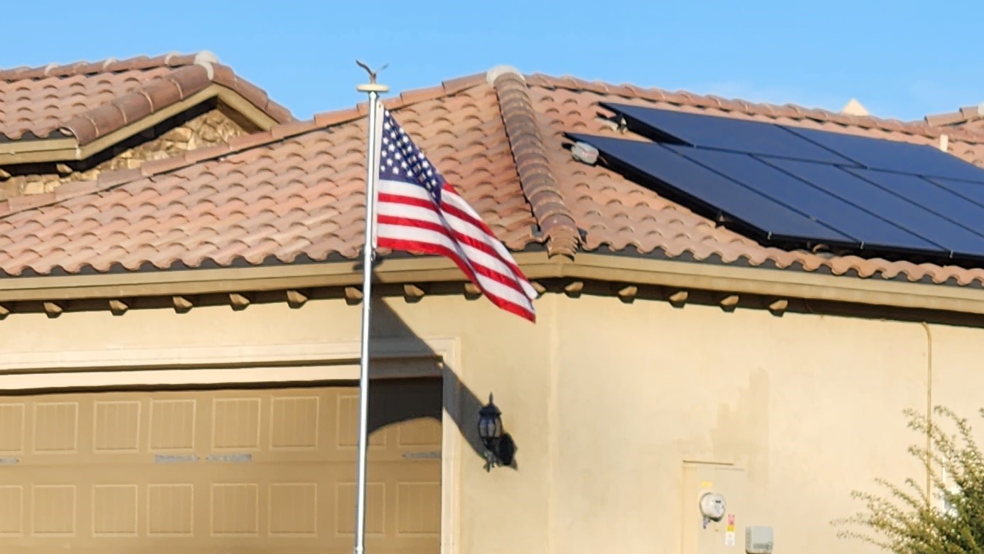 I spotted a neighbor’s flag fluttering on the occasional breeze and casting a mirror image on their house in the late afternoon sun.