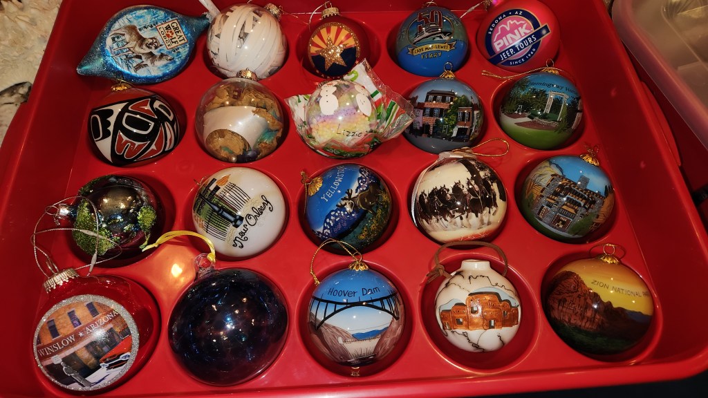 But perhaps one of my favorite holiday traditions is a fairly new one. Since Greg and I have been together, we have made it a point to buy a souvenir Christmas ornament when we are traveling. Fortunately, it’s easy to find one year round, so our collection continues to grow.