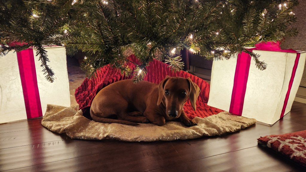Then, in an attempt to stop it from happening again, I covered the chords with a big blanket. There’s no way to keep Enzo from crawling under the tree. He’s decided curling up between the tree stand legs on the skirt is his favorite new place.