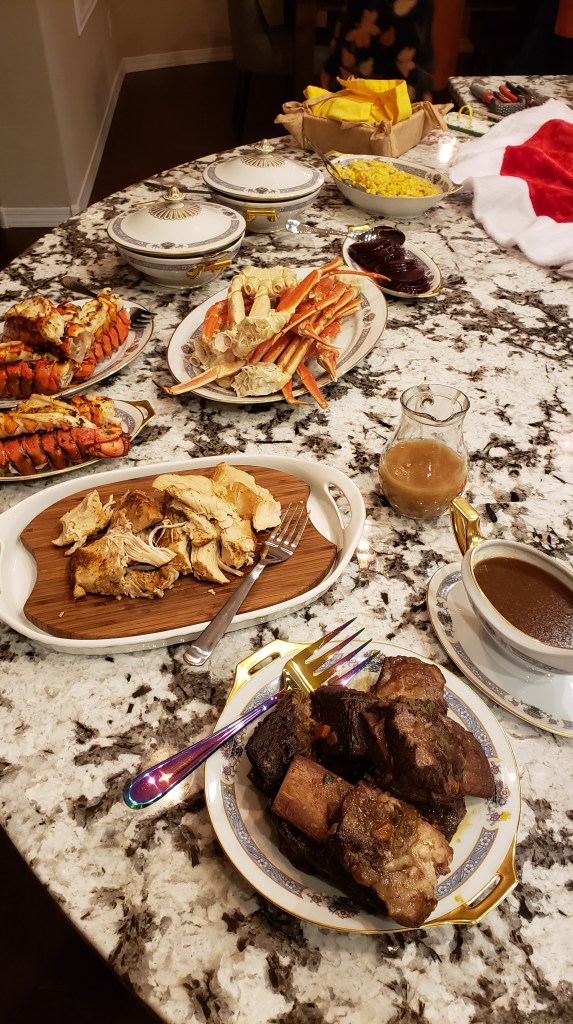 Last year, our neighbors’ daughter wanted to give her mother a surprise visit for the holiday. In cahoots with her father, Nicole arranged for crab and lobster to be shipped to our home, which we prepared along with short ribs and even a small turkey breast for the traditionalists in the family. We kept up the ruse that we were going to a favorite restaurant for Thanksgiving, so when Kathleen and David came to pick us up … Surprise!