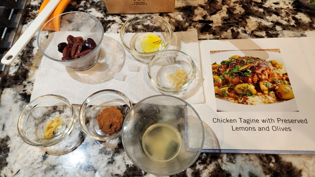 As I was flipping through some old recipes in search of something different, I came across a recipe for Moroccan chicken with preserved lemons and olives. I remembered seeking it out when I returned from my trip and making it. I also remembered it was delicious. This week I tracked down preserved lemons, completing my ingredients list.