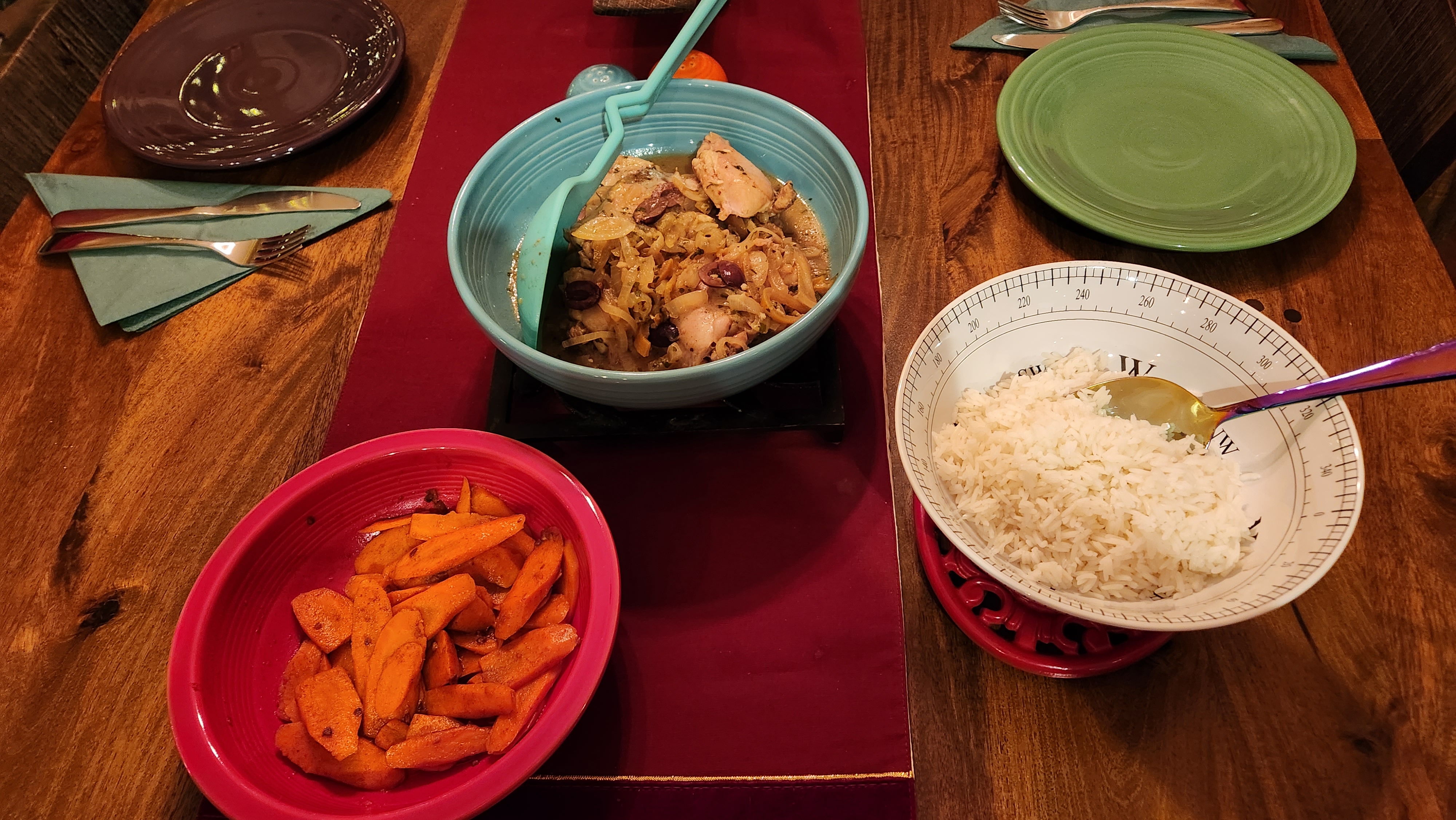 A little slicing and mincing, some measuring and the menu was set for a simple, yet somehow exotic, evening meal. It was easier than I remembered. Starting out with cooking the onions down and getting the carrots steaming.