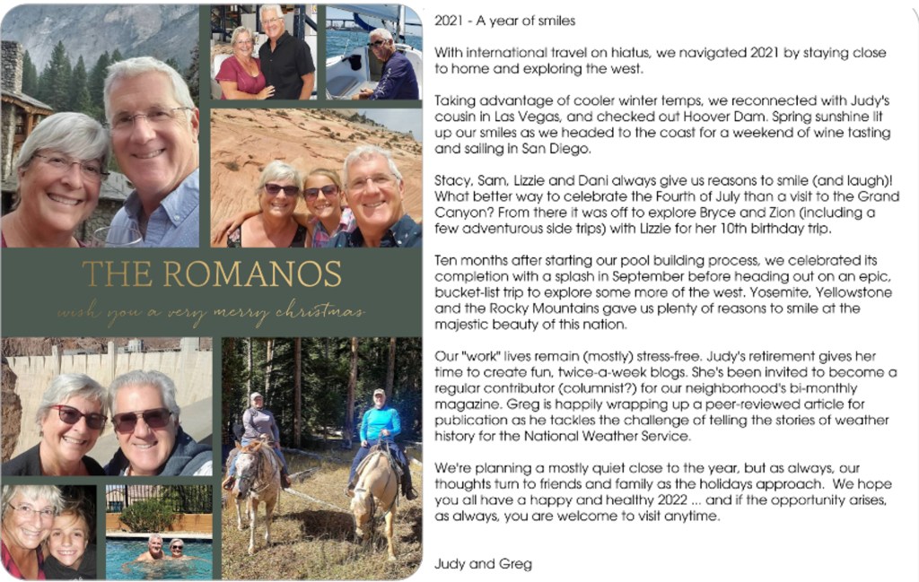 For years, Greg and I have spent a day over Thanksgiving weekend drafting one of those nice, long, juicy, news-filled letters about the year coming to an end. We even included pictures. Those were sent off for printing, hand-signed, folded and mailed to nearly 100 friends.