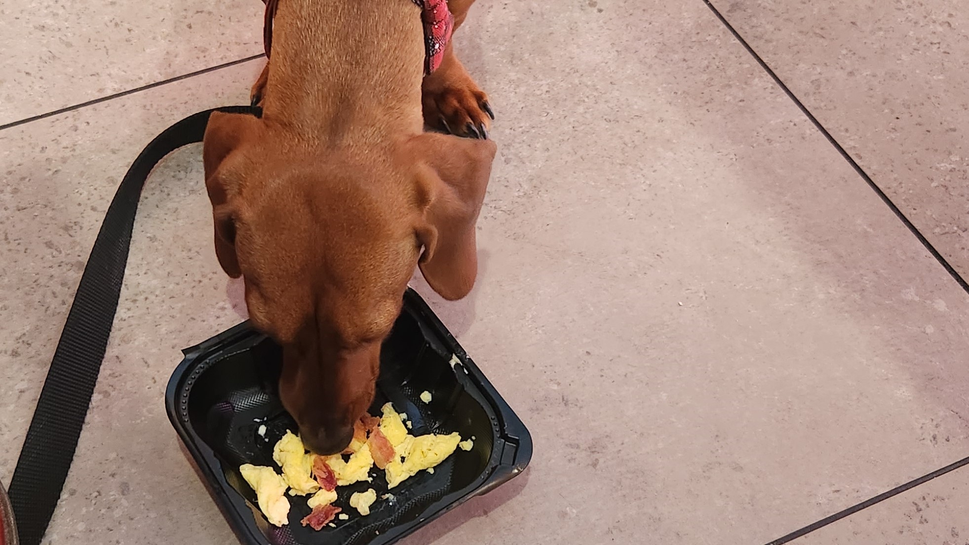 Enzo got scrambled eggs and a little of “mom’s” bacon.