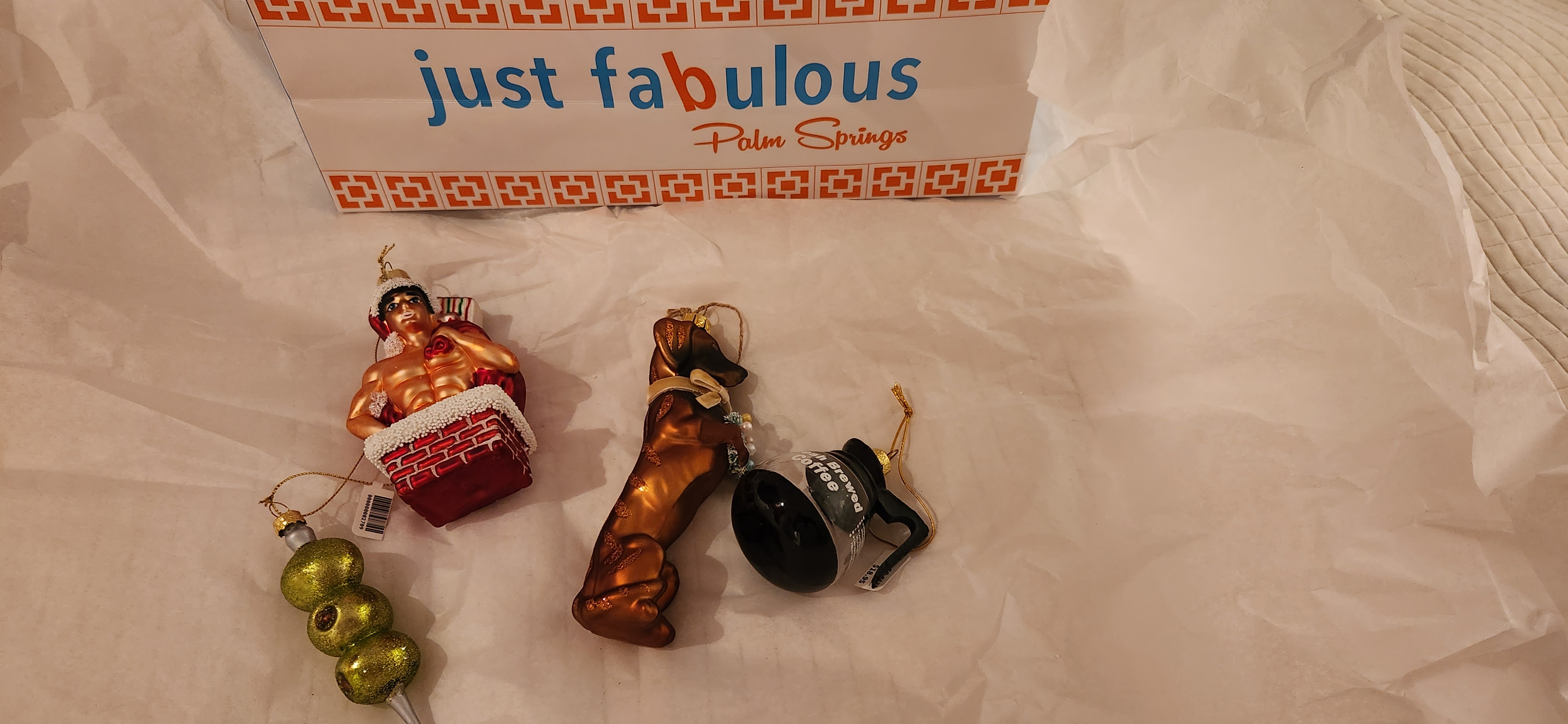 A day of strolling the many shops and galleries along Palm Canyon Drive was in order, which included required stops at some of our favorites. At Just Fabulous, we found some ornaments to augment our Naughty/Boozy tree and other Christmas Trees, along with some gifts for friends.