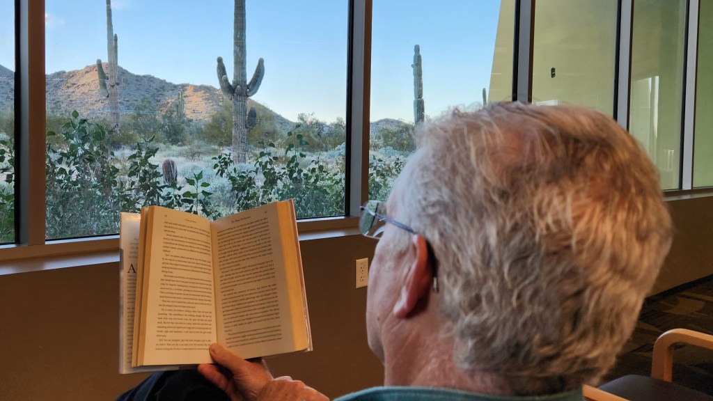 As we arrived, we marveled at the scene. Through big glass doors the view goes all the way to the wall of windows offering an incredible view. That is because the traditional library shelves are short enough to make the room light and bright along with the scenic expanse of cacti, wildlife and the base of the mountains.