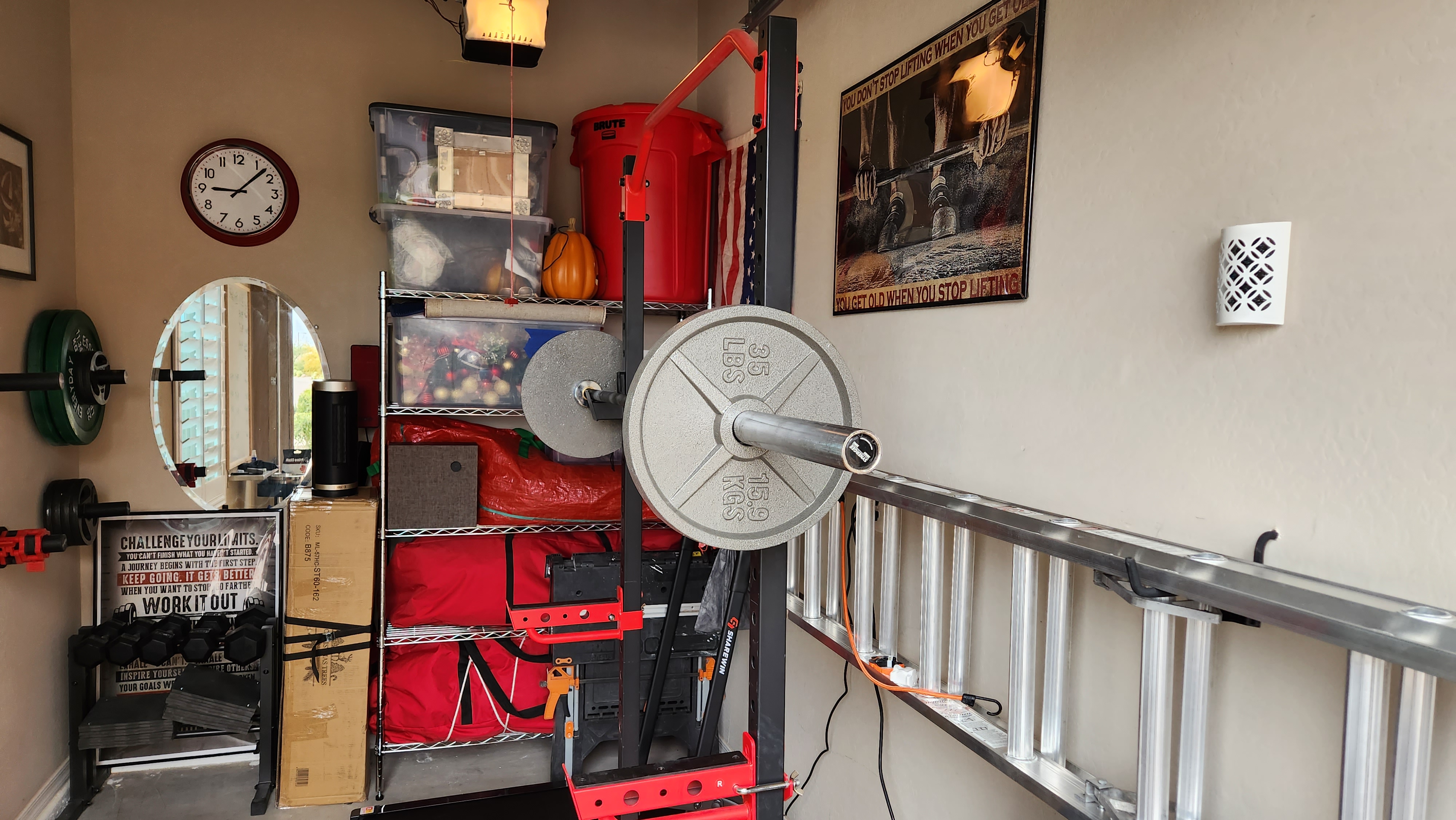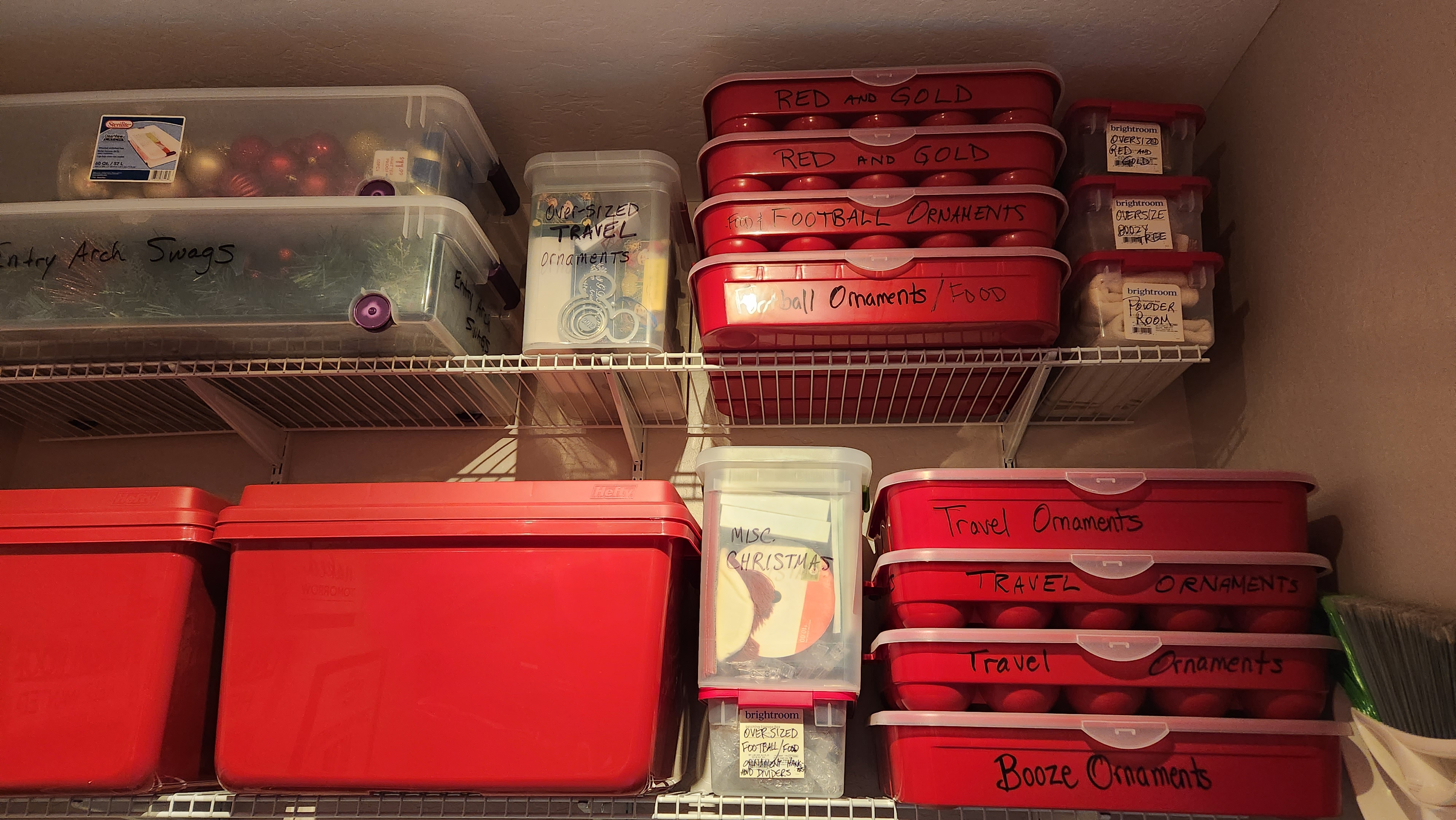 The next morning we emptied the closet of all my Christmas goodies. Some made their way onto a high shelf in the pantry. Other boxes are filling the shelves in the laundry room. Greg even sacrificed a small section of his home gym for my four Christmas trees.