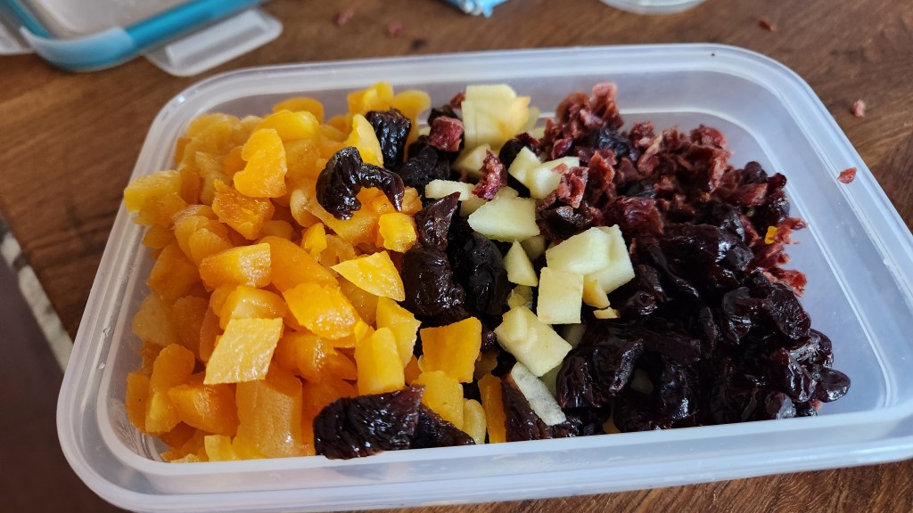 I diced up the fruit and even added a couple other flavors I had in the pantry. I threw in a quarter of a cup of dried tart cherries and a quarter of a cup of craisins, reducing the whole cup of prunes called for in the recipe by half.