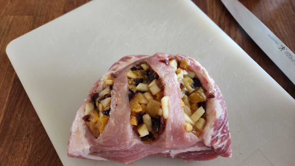 The process was ridiculously simple. Boil a single cup of water, soak the fruit for five minutes and drain. Slice pockets into the pork loin, stuff in the chopped fruit and rub on an herb mixture.