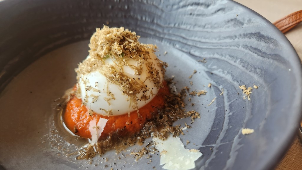 Organic soft-boiled egg with a summer truffle tomato sauce