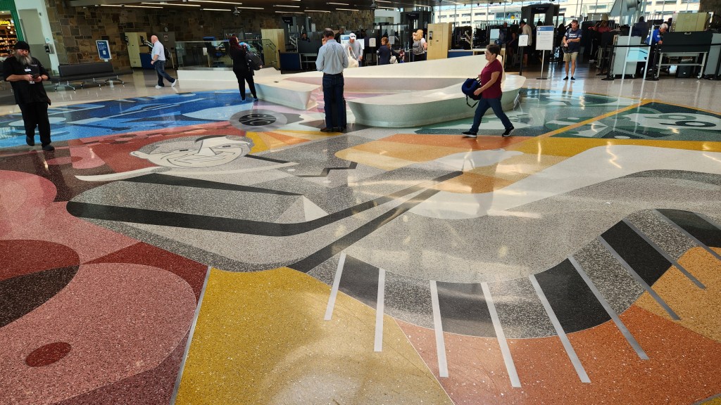 Finally, there’s something about the ambiance of these smaller airports. They celebrate all the good things about their states and towns. In Bismarck, a giant triceratops skeleton head greets you as you enter security. It makes you realize how short human history truly is. In Alaska, there is a virtual zoo of Alaskan animals, all stuffed and in display cases, along with dozens of displays of Alaskan tribal art and artifacts. To be fair, PHX has a museum spread throughout the terminals, but there is such a hustle-bustle environment that it’s easy to miss.