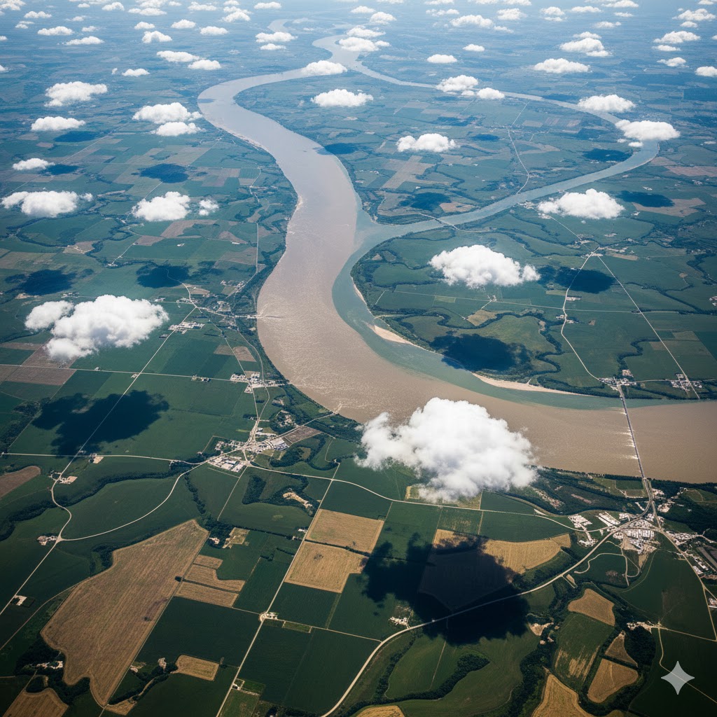 The sun is almost too bright above the clouds. I raise the shade and glance out often, but keep it closed to doze and let my mind wander. At one point I notice two rivers converging beneath the scattered popcorn-like puffs of white. I think it’s south of St Louis where the mighty Mississippi forks. Later, when I log into the wifi, I confirm my guess. I’ve driven the bridge across that expanse of farmland and navigable waterway.