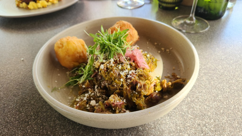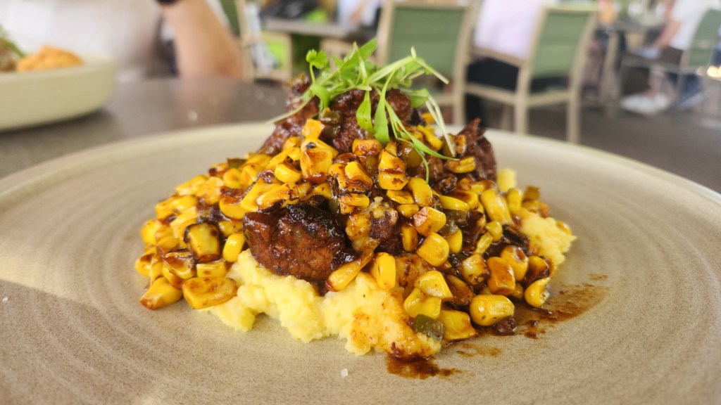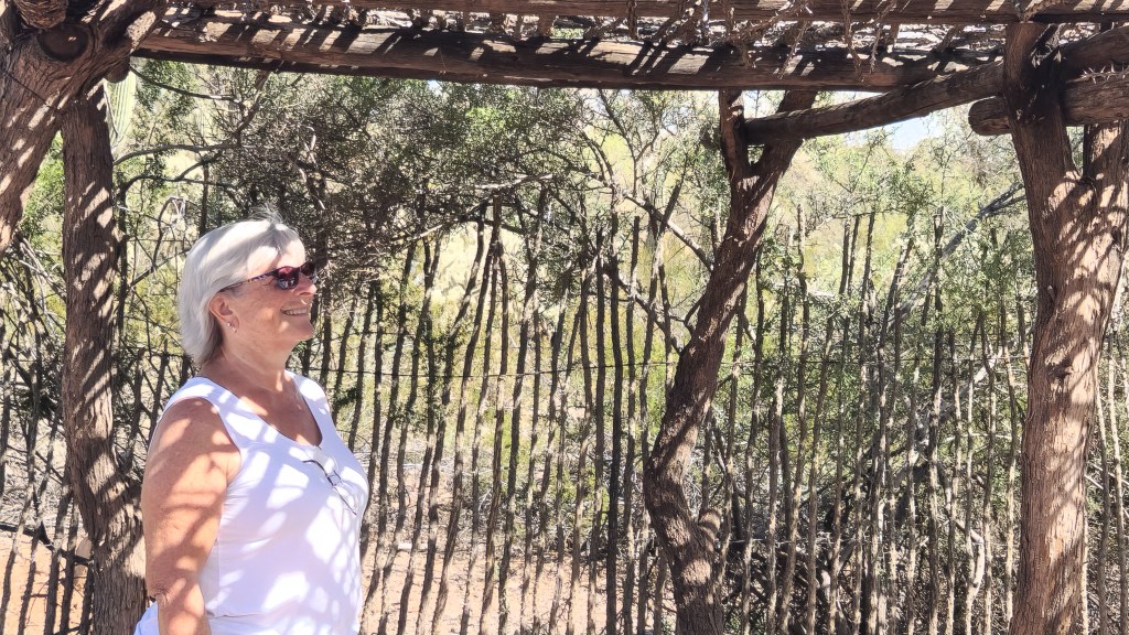 We’d planned ahead and made a reservation at the Gertrude’s by Tarbell restaurant inside the front entrance for a late lunch. Our timing worked out perfectly as we meandered along the final section of trail and took the charming hostess up on her offer of a partially shaded outdoor table. Our waitress suggested we pair our cocktails with the crispy nopales from the desert with molé. WOW! What a surprise. The edible, flat pads of the prickly pear cactus were lightly breaded and surprisingly sweet. They were the perfect starter. With an entree menu featuring desert botanicals, it was tough to choose, but we settled on the beef tips with polenta and roasted cheese and the Green chili pork with Anaheim peppers and polenta cakes. A couple of curated cocktails made the lunch complete!