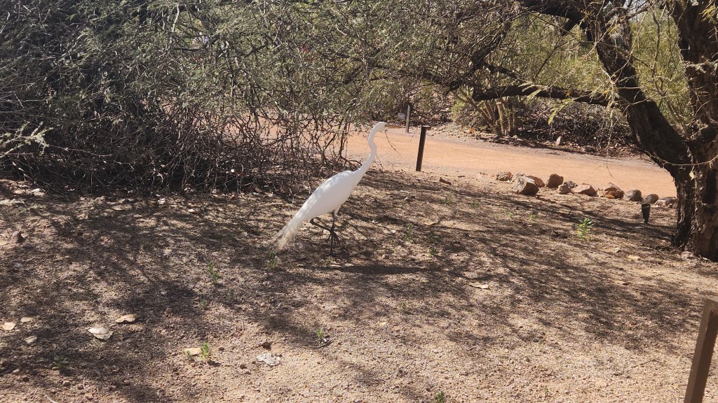 As we turned a corner near the oasis we spotted a great white egret hanging out along the path near the swamp-like pond.