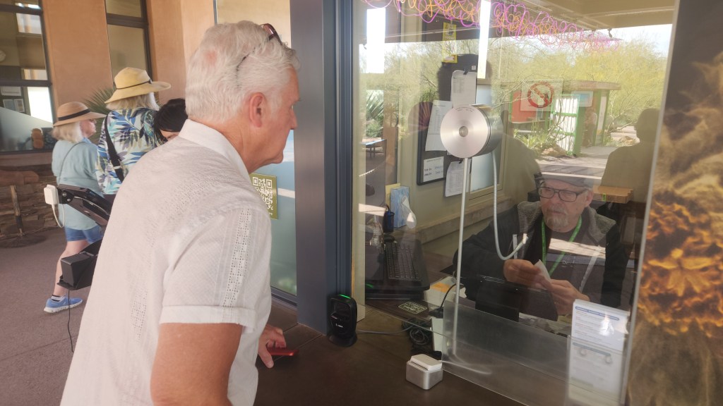 With the sun shining brightly, we headed to Papago Park and turned into the large (and free!) parking lot, somehow snagging a partially shaded spot close to the entrance. We were a little surprised by the crowds, but with the weather, it was to be expected. We sauntered across the bridge at the entrance and made our way to the payment window.