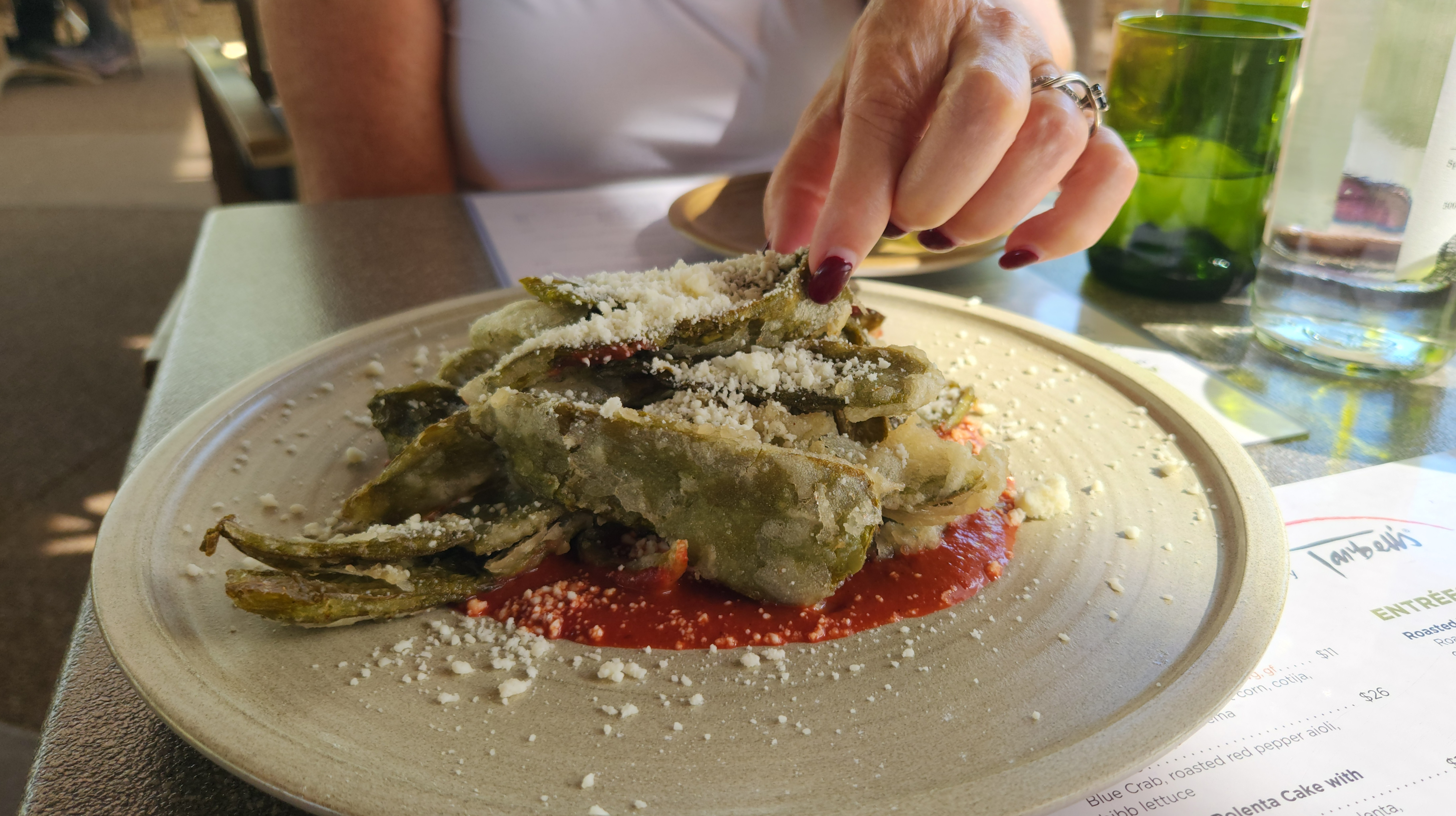 We’d planned ahead and made a reservation at the Gertrude’s by Tarbell restaurant inside the front entrance for a late lunch. Our timing worked out perfectly as we meandered along the final section of trail and took the charming hostess up on her offer of a partially shaded outdoor table. Our waitress suggested we pair our cocktails with the crispy nopales from the desert with molé. WOW! What a surprise. The edible, flat pads of the prickly pear cactus were lightly breaded and surprisingly sweet. They were the perfect starter. With an entree menu featuring desert botanicals, it was tough to choose, but we settled on the beef tips with polenta and roasted cheese and the Green chili pork with Anaheim peppers and polenta cakes. A couple of curated cocktails made the lunch complete!