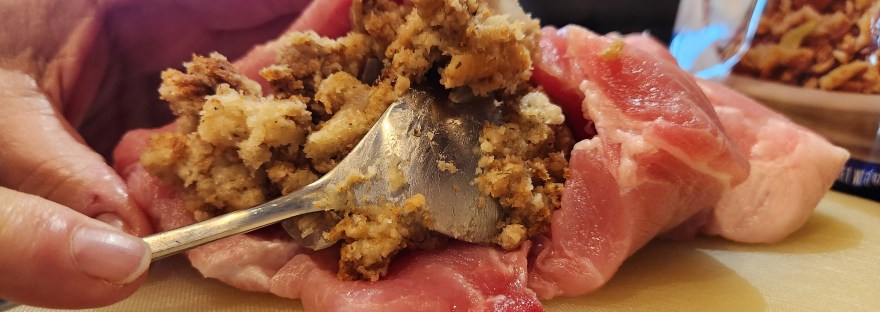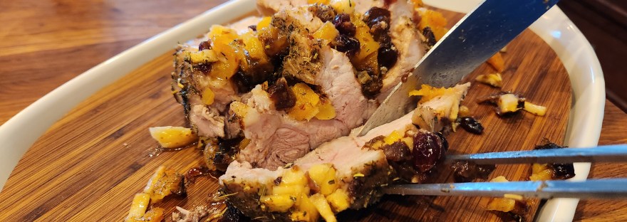Carving the loin into slices revealed a scrumptious-looking pile of fruit-enhanced slices.