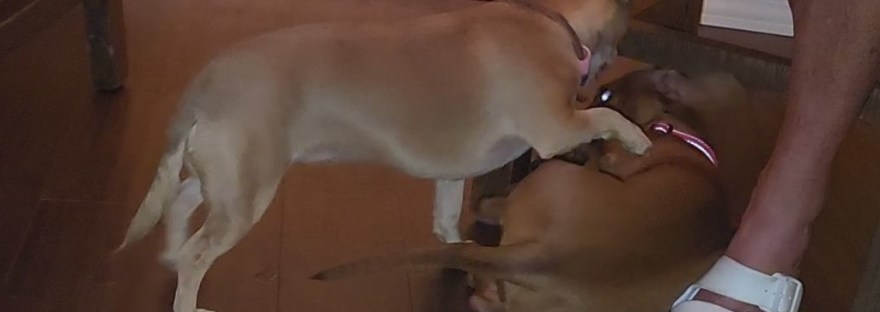 The two of them wrestled and frolicked under the table while we ate dinner and chatted the evening away.